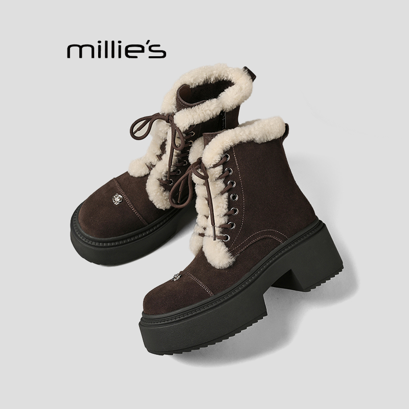 MILLIE'S/妙丽女鞋真皮粗跟马丁靴冬款复古中跟冬季加绒短筒靴子Q