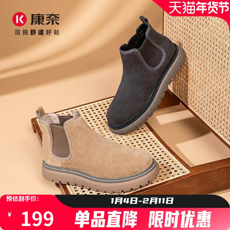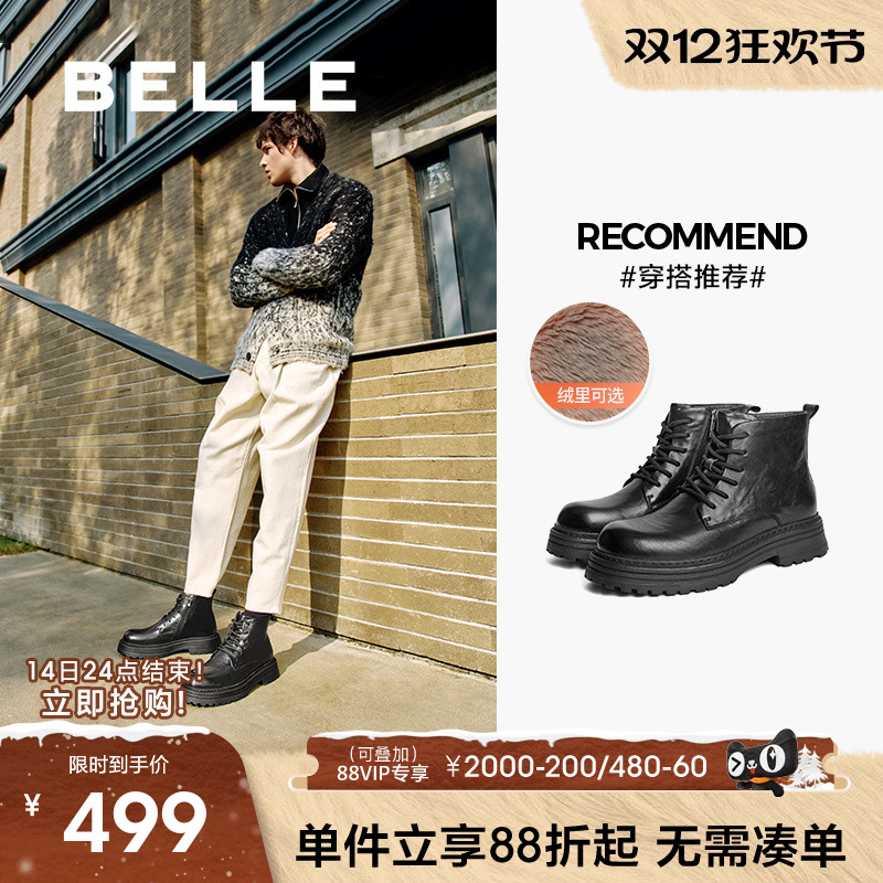 百丽男鞋加绒保暖马丁靴冬款皮鞋厚底增高休闲黑色短靴子8NC01DD4