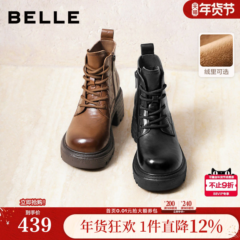 百丽女鞋英伦风真皮马丁靴子女冬款加绒保暖厚底休闲短靴B2942DD5