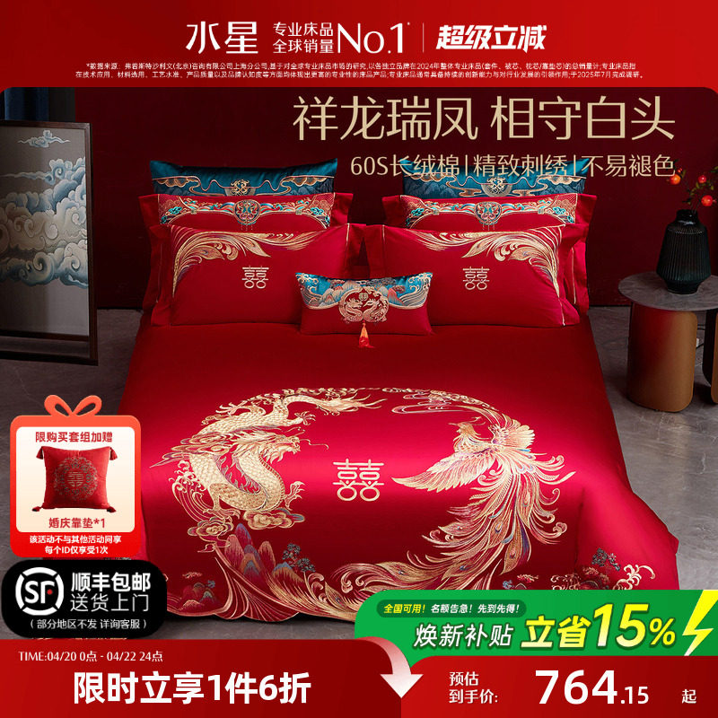 水星家纺60S长绒棉婚庆四件套红色全棉刺绣套件结婚轻奢被套床品