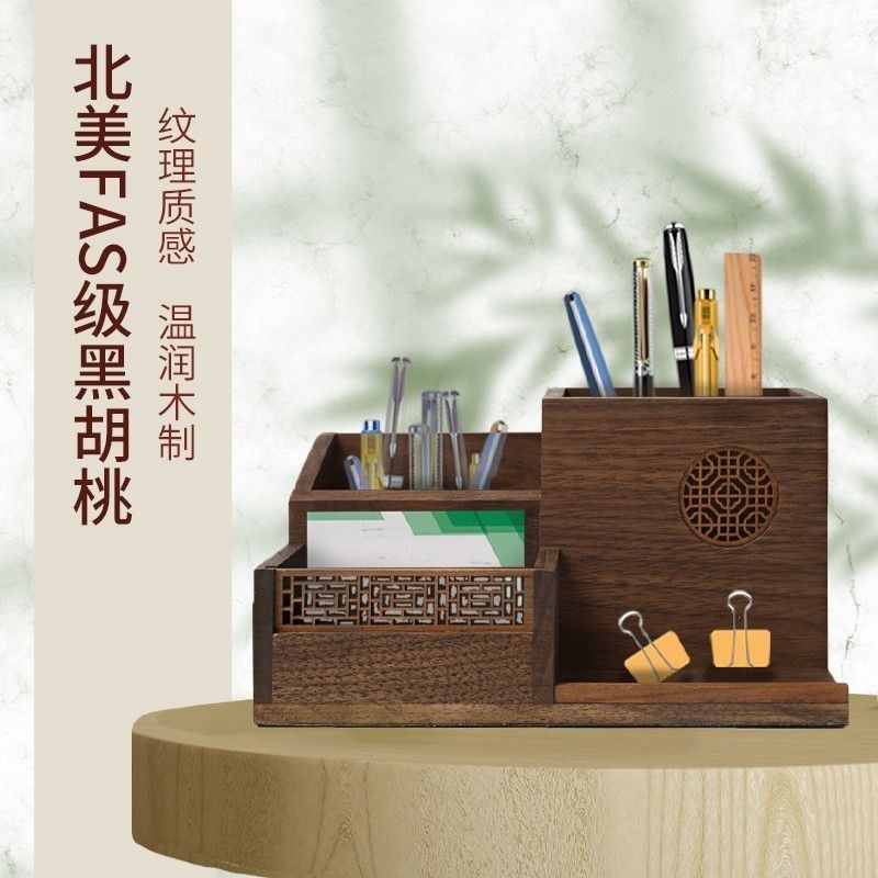 黑胡桃实木质笔筒中式领导办公室桌面摆件送礼简约书房笔桶收纳盒