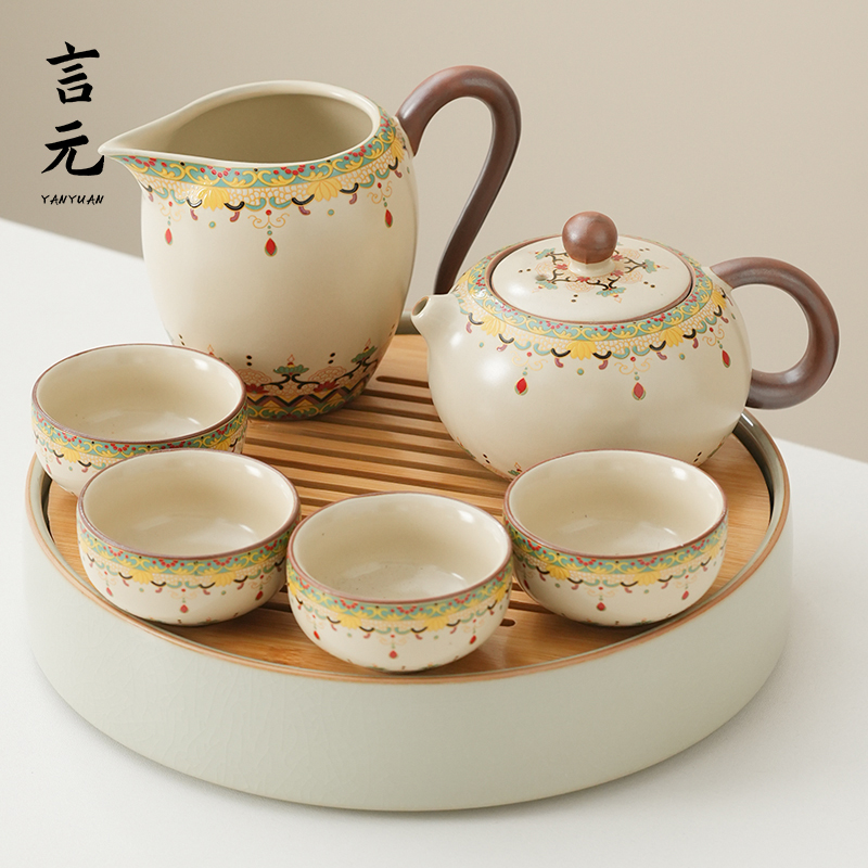 米黄汝窑功夫茶具套装干泡茶盘一壶四杯家用高档泡茶壶防烫小套组