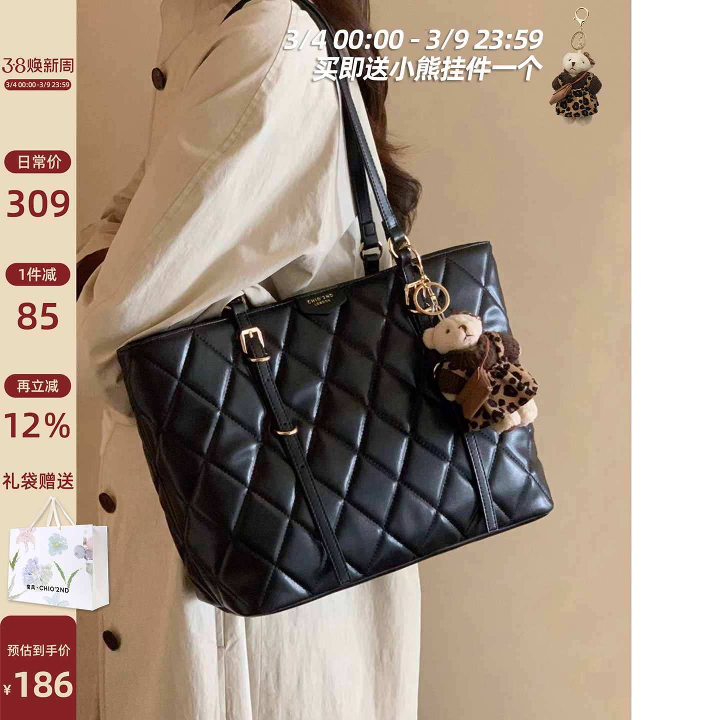 南风Chio2nd 柏林新梦托特包包女款时尚大气通勤菱格黑色单肩大包