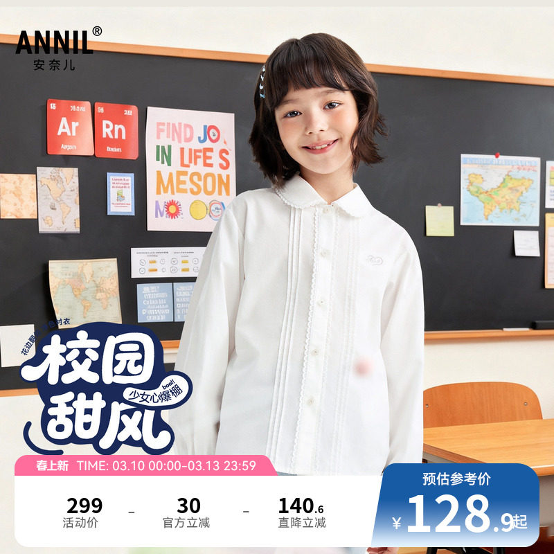 安奈儿童装女童翻领长袖衬衣2026春新款纯色全棉轻薄时尚透气衬衫
