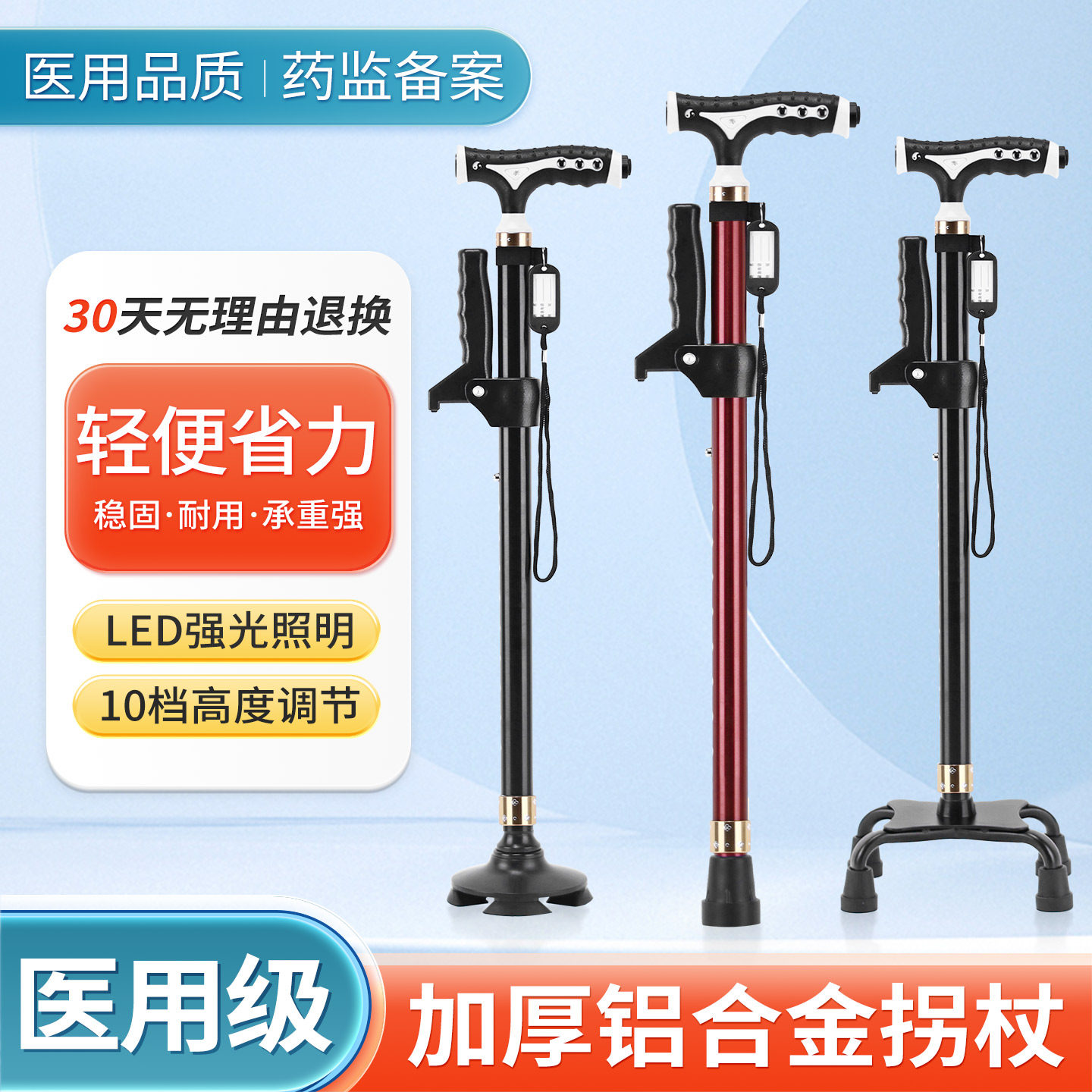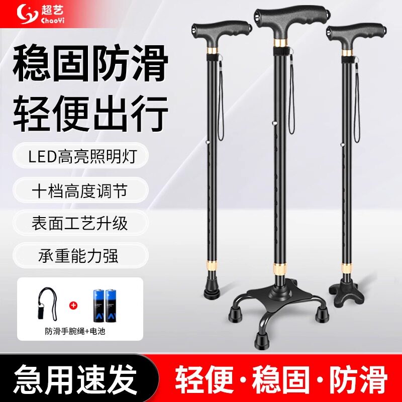 嘉仕宁老人拐杖四脚伸缩手杖老年人杖铝合金轻便多功能灯防滑拐棍