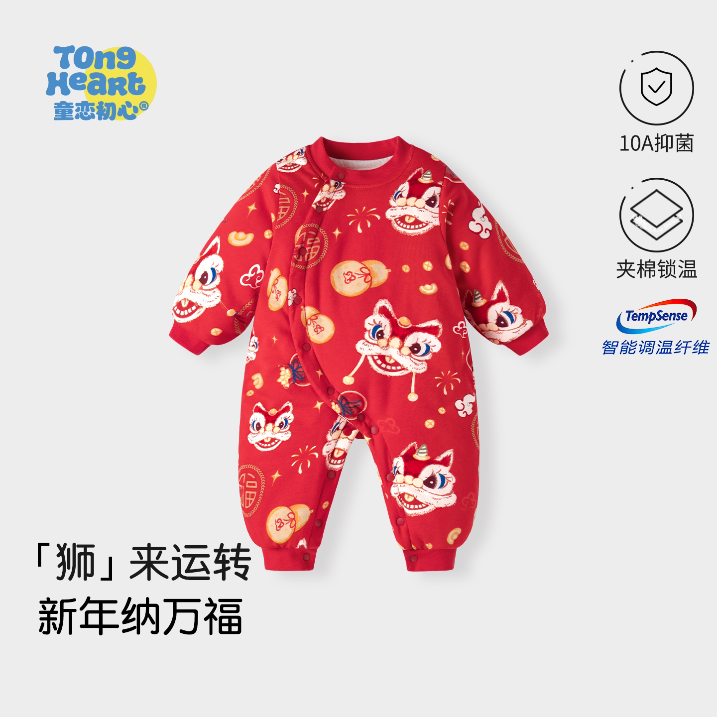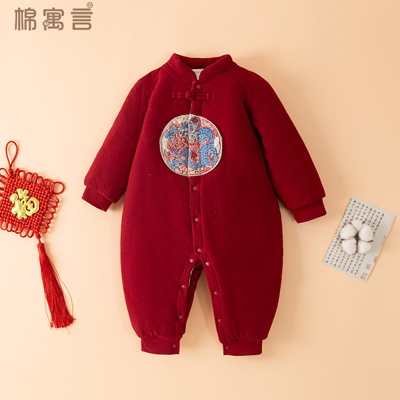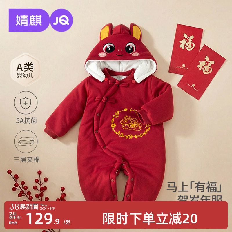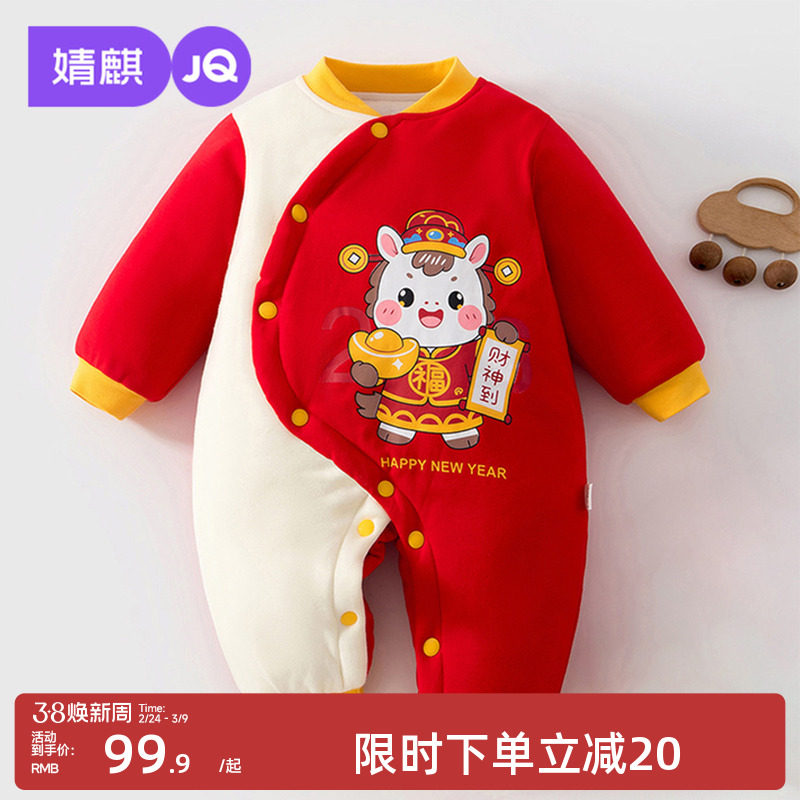 婧麒新生婴儿连体衣冬季加厚喜庆拜年服满月百天新年装婴幼儿棉服
