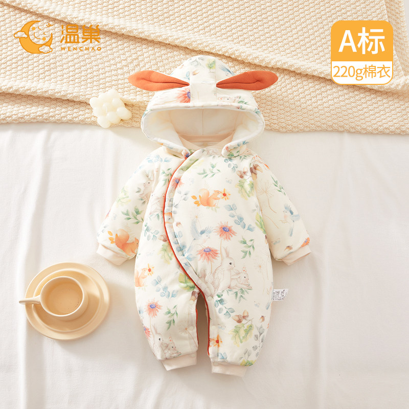 婴儿连体衣冬季加厚300g夹棉棉服A类新生儿连帽保暖外出服防风衣