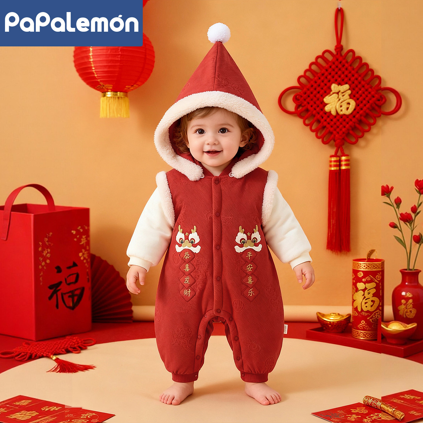 柠檬爬爬婴儿连体衣冬季加厚保暖宝宝夹棉连帽哈衣过年喜庆拜年服