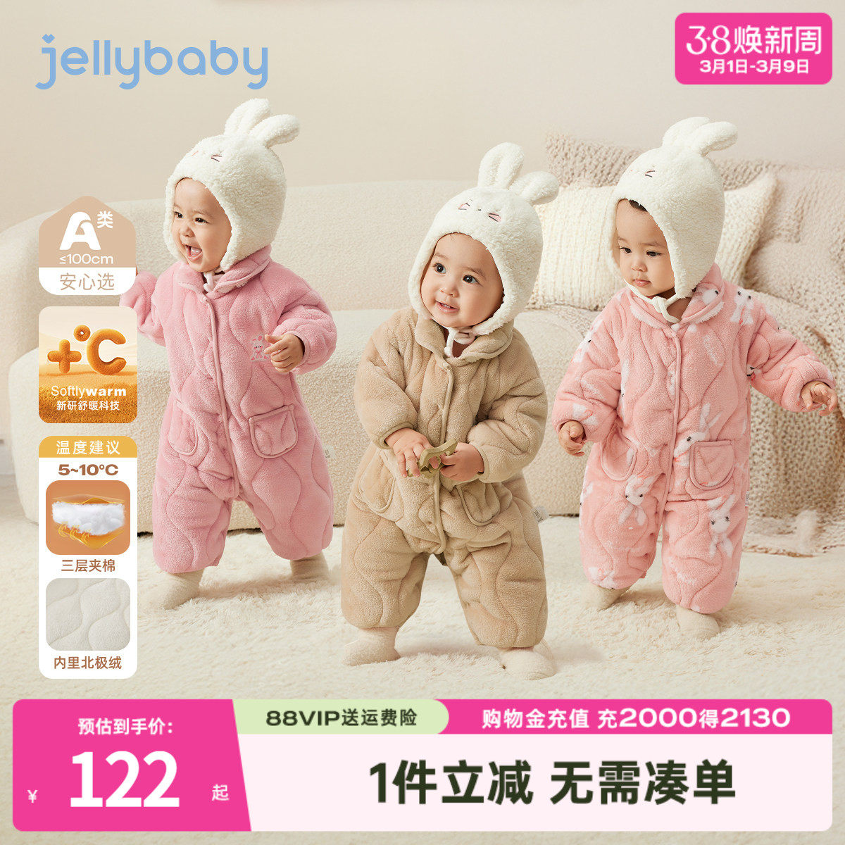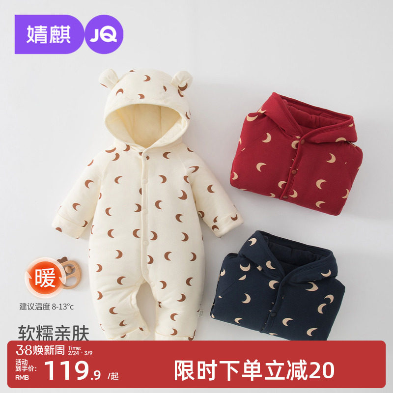 婧麒婴儿连体衣冬季加厚加绒保暖连帽哈衣新生儿夹棉外出爬服衣服
