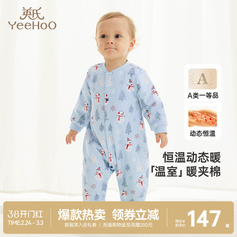 [夹棉加厚]英氏婴儿连体衣秋冬保暖新生儿冬季宝宝衣服冬新款哈衣