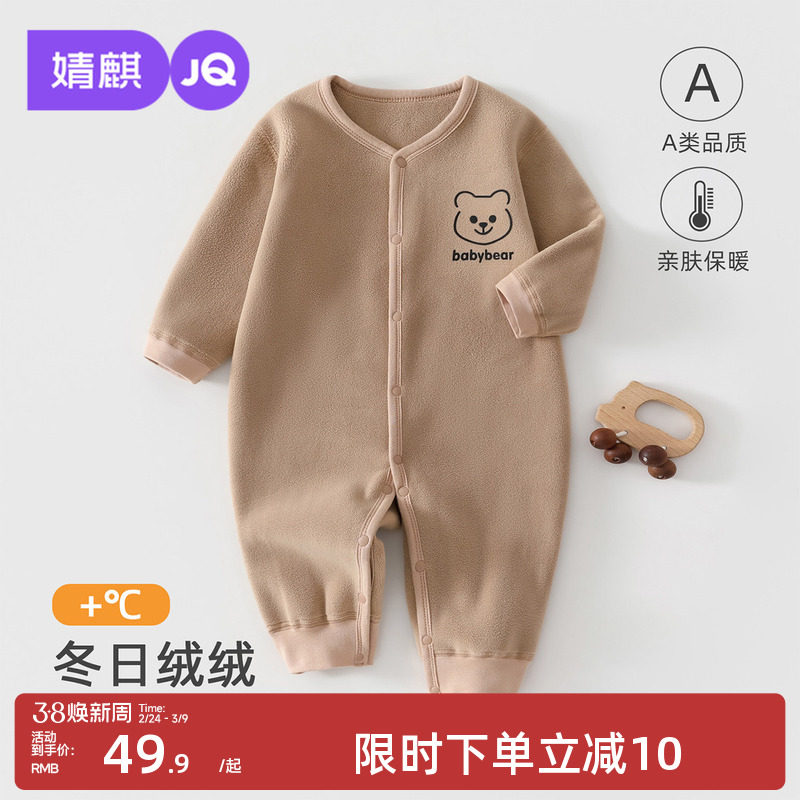婧麒婴儿连体衣冬季加厚双面摇粒绒长袖开襟爬爬服宝宝保暖连身衣