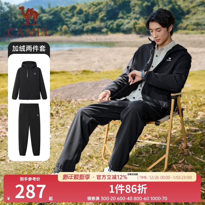 骆驼男装户外运动套装春秋季防泼水长袖连帽外套休闲长裤两件套女