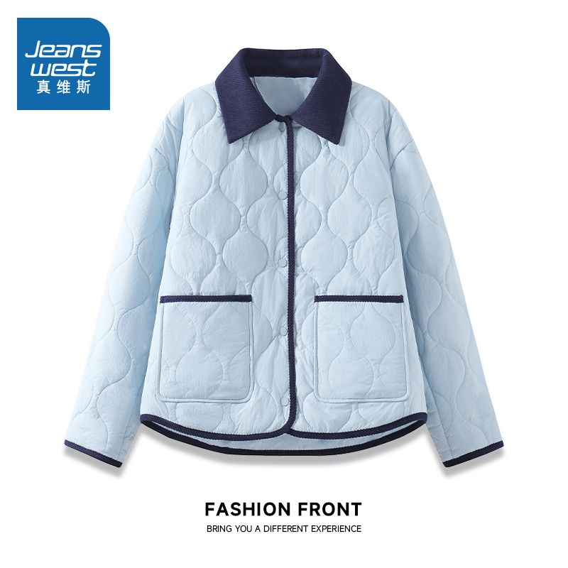 NOW真维斯轻薄棉服女款2025新款冬韩版撞色翻领菱格夹棉保暖外套