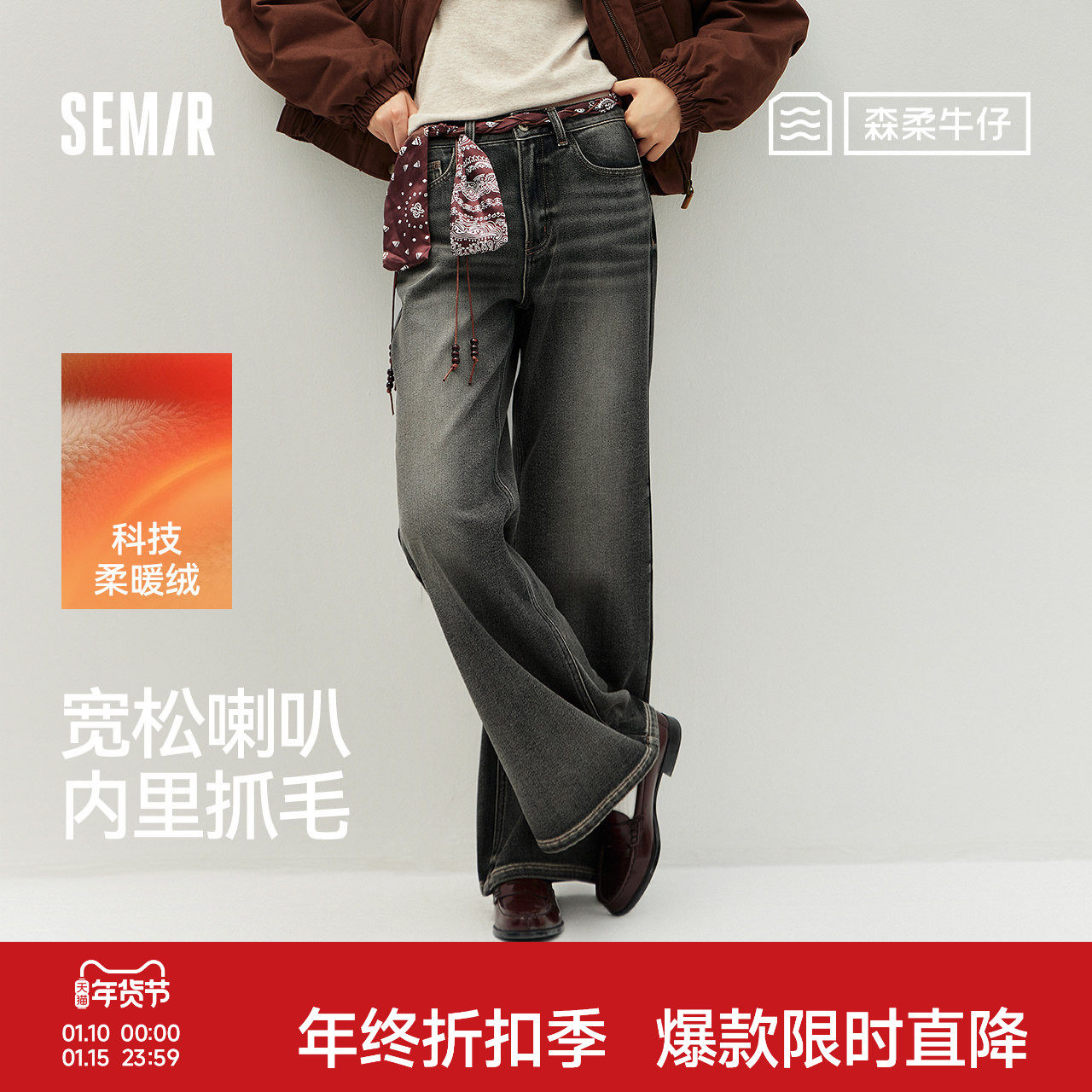 商场同款|森柔森马牛仔裤女冬季弹力分割抓绒长裤2025新款喇叭裤