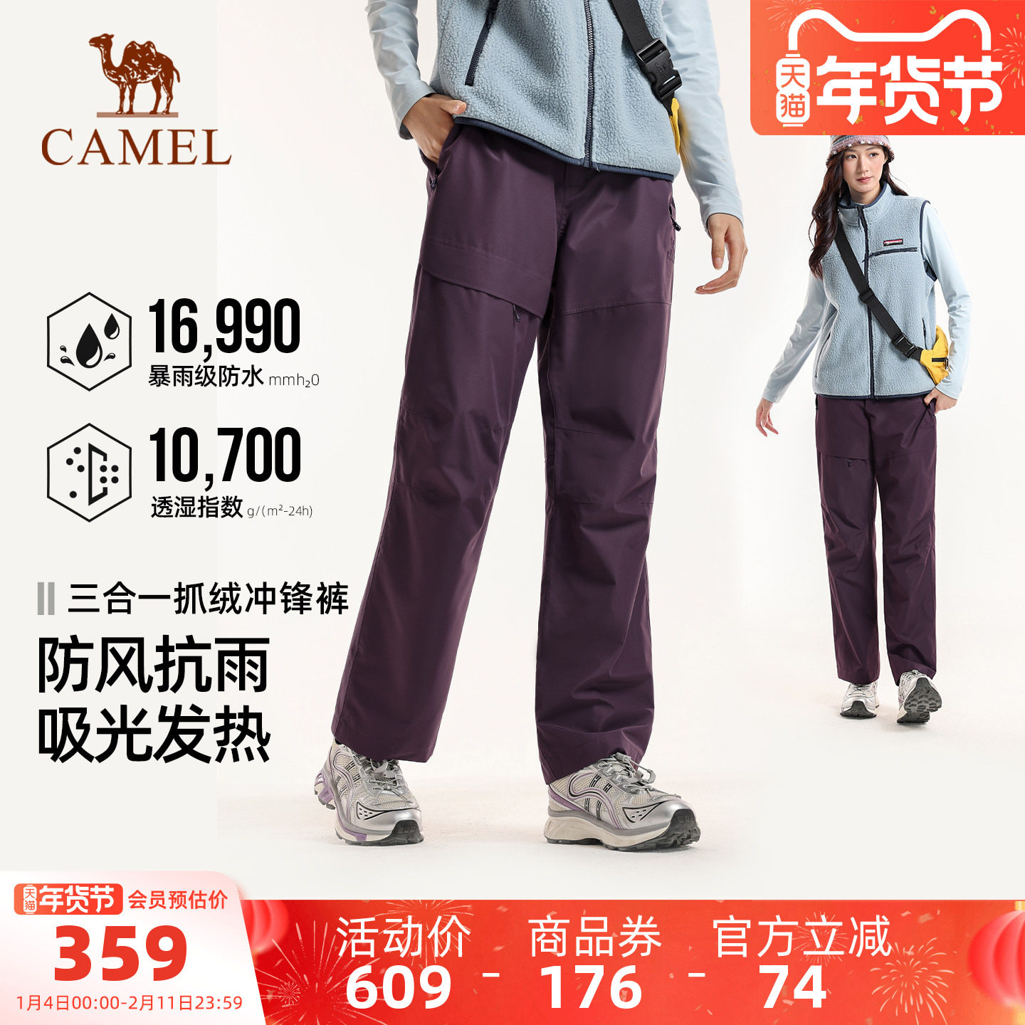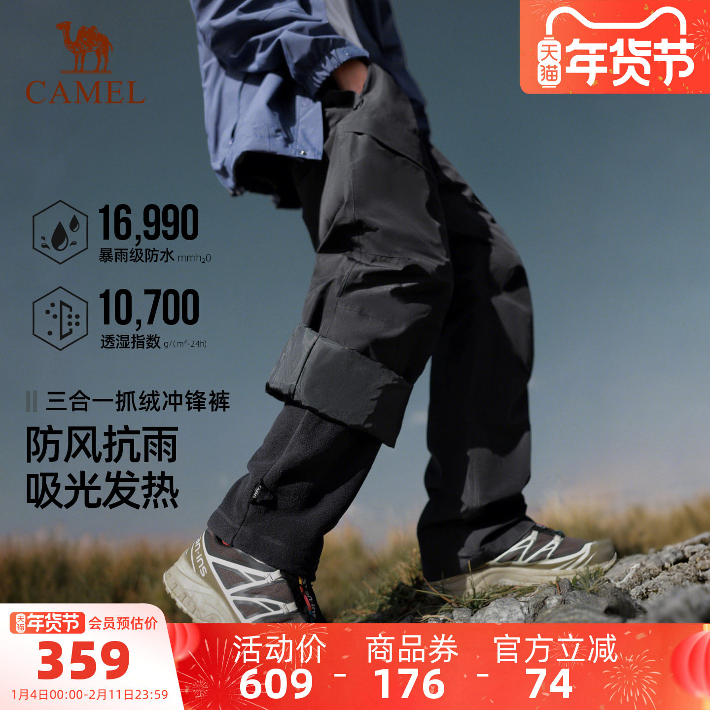 骆驼户外冲锋裤男三合一防风防水抓绒内胆高透湿防失温登山长裤女