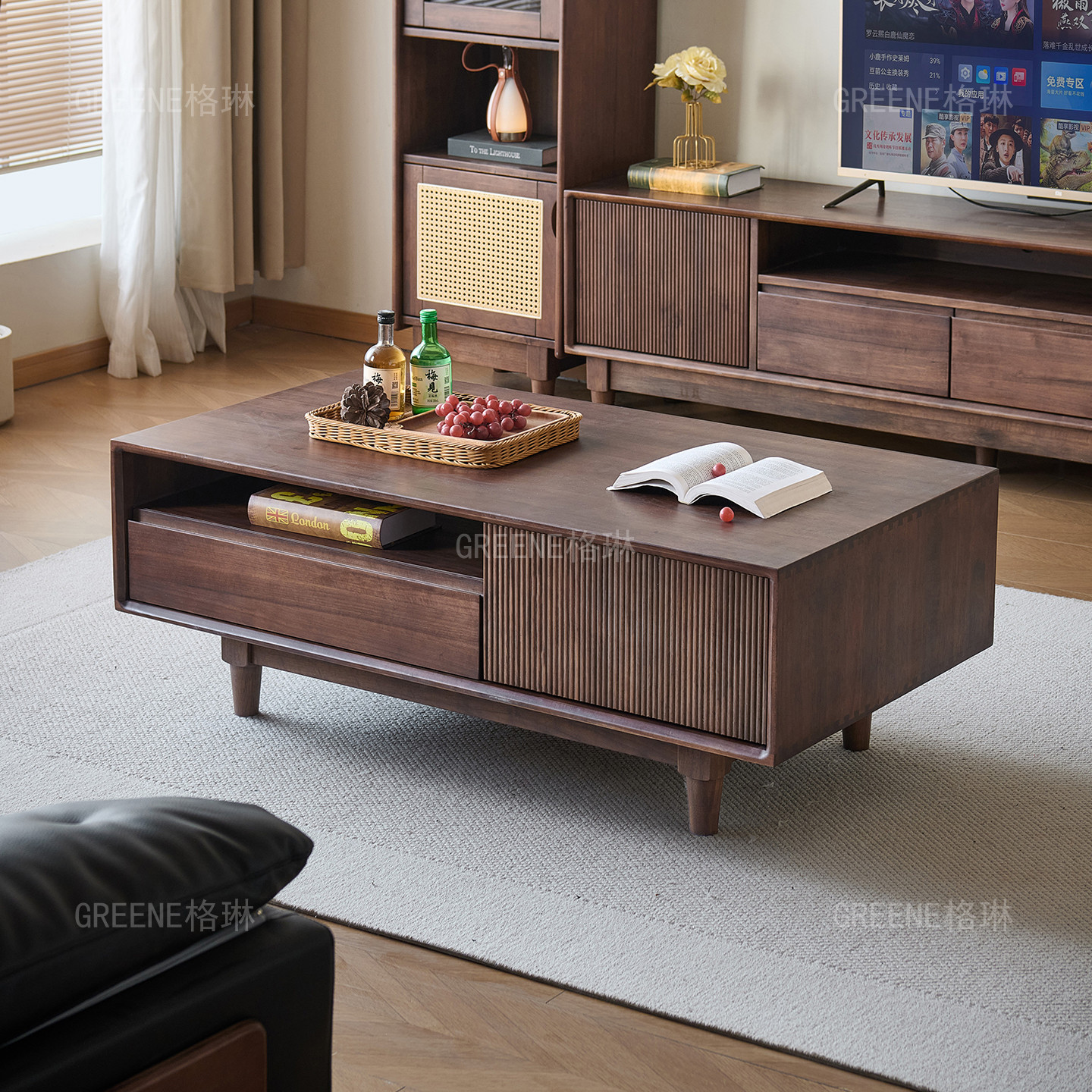 北美黑胡桃木茶几电视柜组合复古风客厅家用纯实木长方形茶几原木