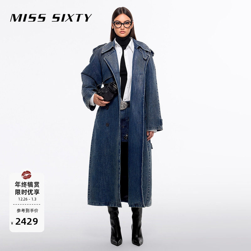 Miss Sixty牛仔大衣女复古气质翻领双排扣附腰带长款风衣棉服