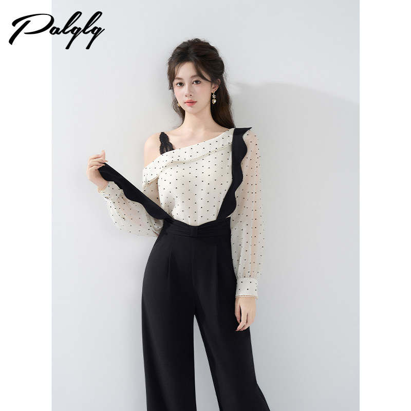 高级感法式波点斜肩衬衫套装女早秋学院风背带长裤巨好看的两件套