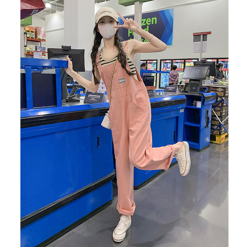 粉色工装背带裤女夏季2024新款小个子学院风宽松减龄直筒休闲长裤