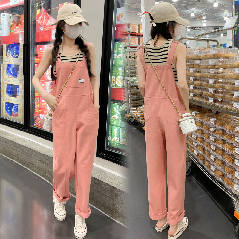 粉色工装背带裤女夏季2024新款韩版宽松学院风百搭直筒休闲长裤子