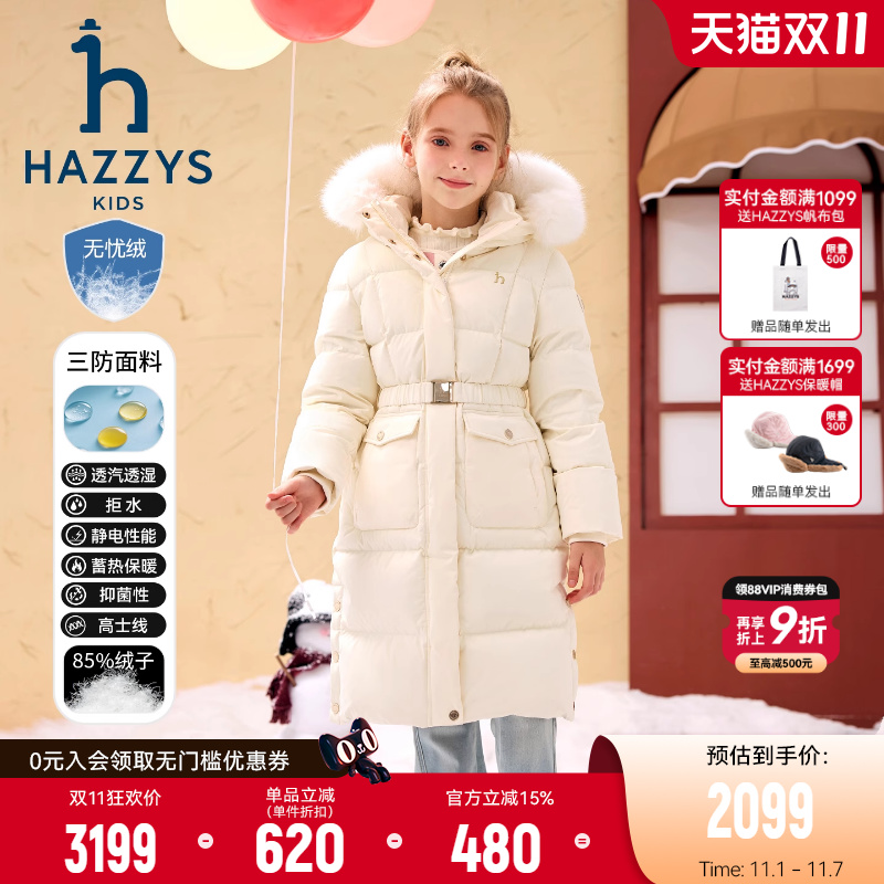 hazzys哈吉斯童装女童长款羽绒服25冬新三防高充绒保暖加厚外套