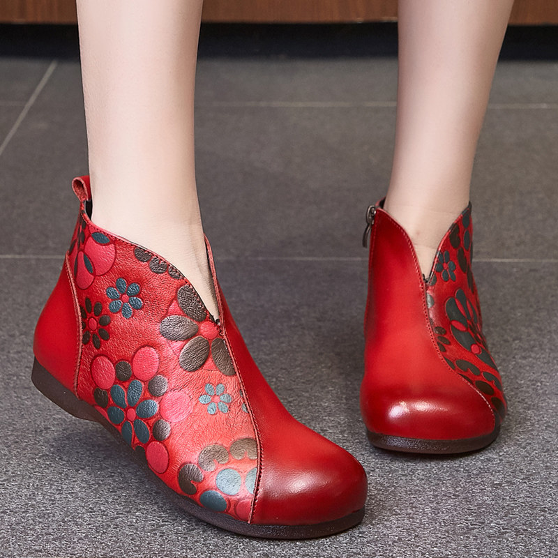 复古民族风妈妈鞋秋冬新款平跟软底中老年加绒棉鞋真皮印花短靴女