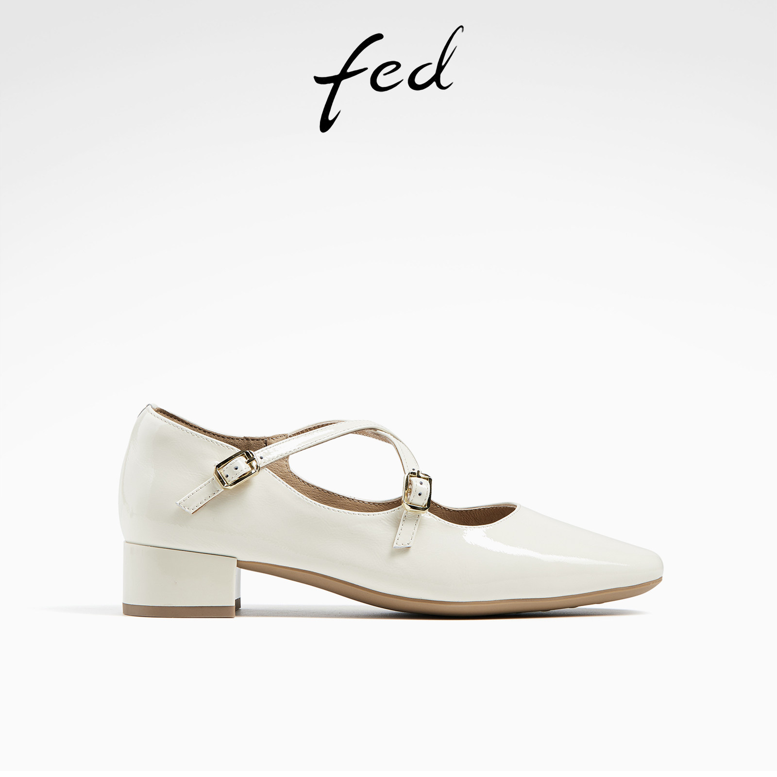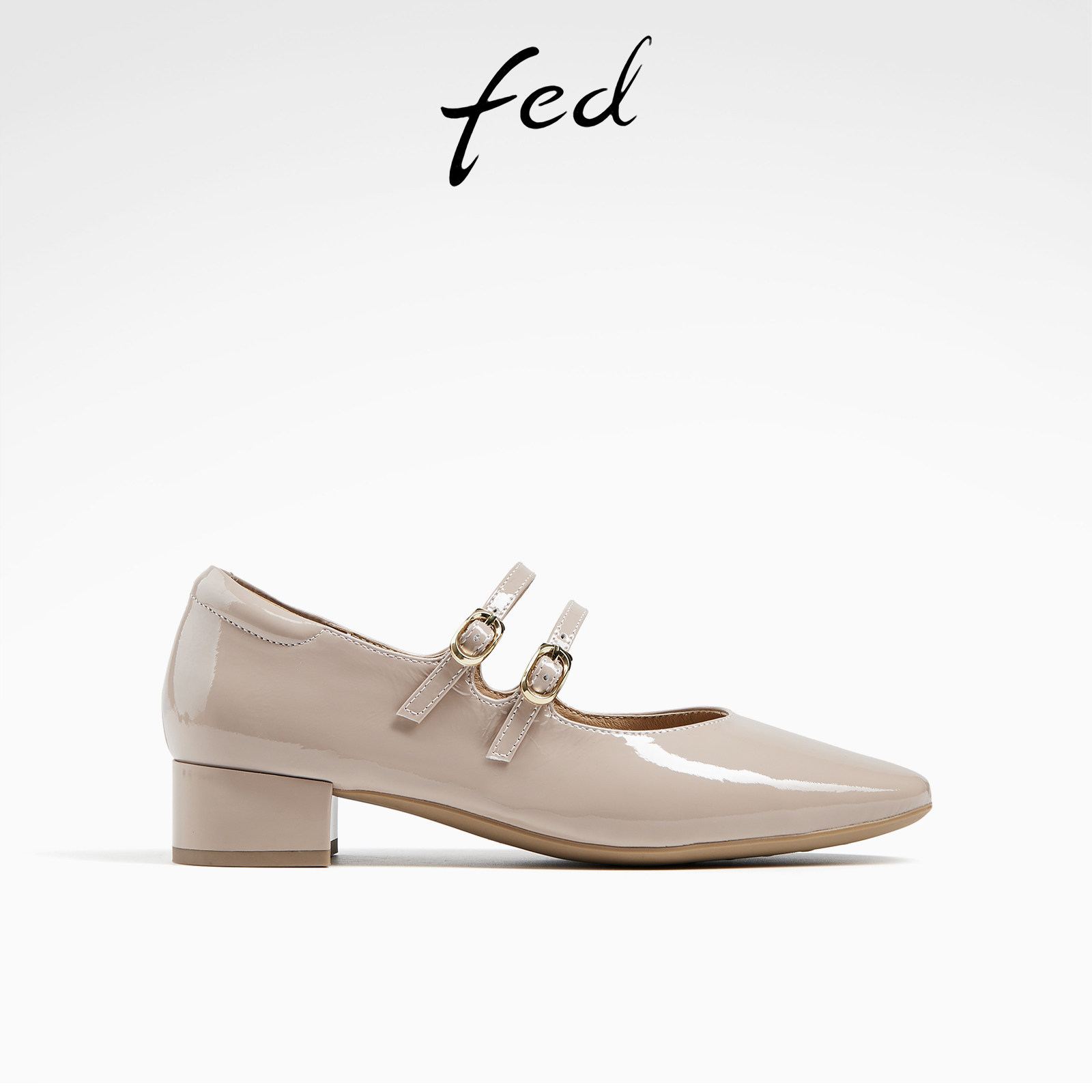 fed真皮漆皮女鞋秋季小方头浅口粗跟单鞋女百搭中跟鞋玛丽珍鞋女
