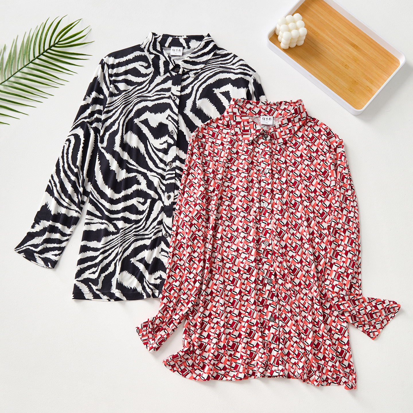 2025秋冬新款100%超细羊毛长袖衬衫女翻领印花薄款大码衬衣打底衫