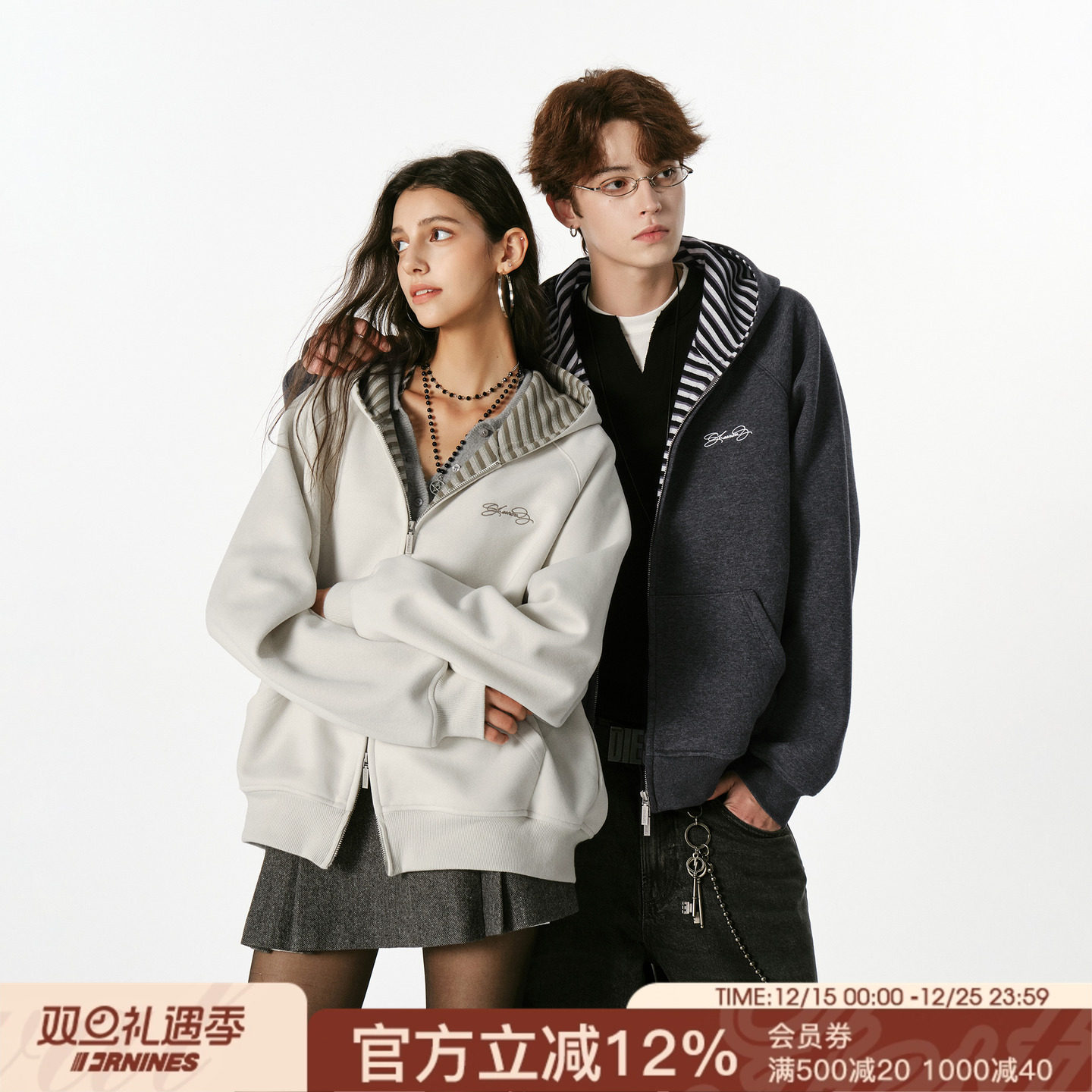 FORNINES条纹拼接刺绣连帽卫衣男女情侣装上衣双拉链开衫春秋外套