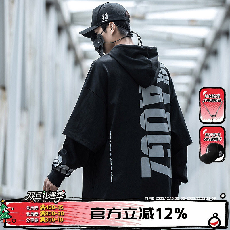 AOGZ国潮牌假两件卫衣男生女春秋2025新款美式连帽上衣情侣装外套