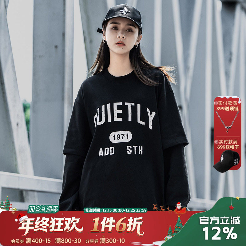 AOGZ国潮牌假两件卫衣男女生春秋季新款字母印花上衣情侣装长袖