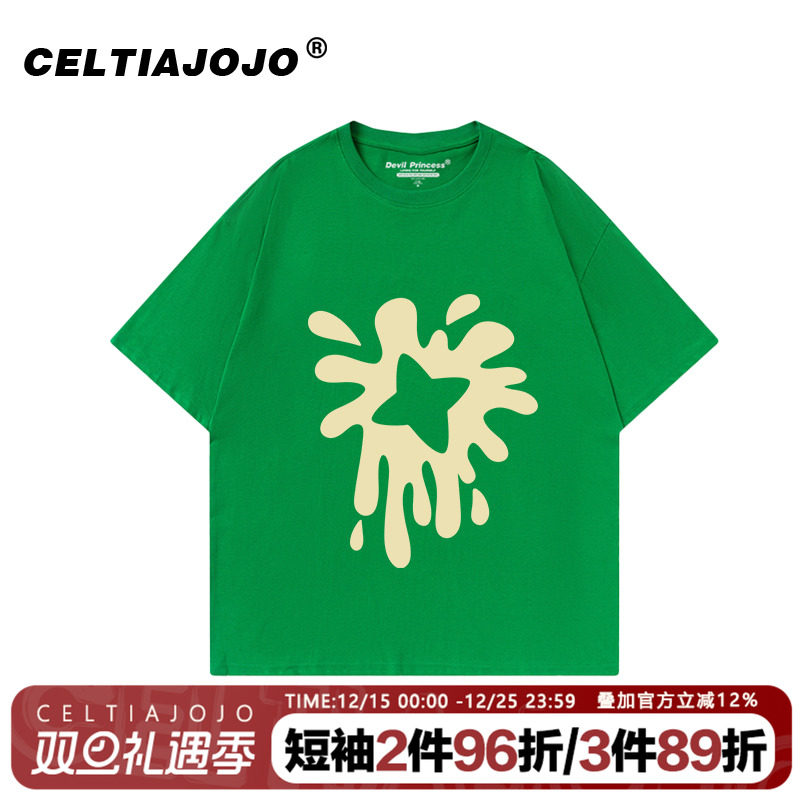 ulzzang设计感复古美式宽松街头bf风大码正肩绿色短袖t恤情侣装夏