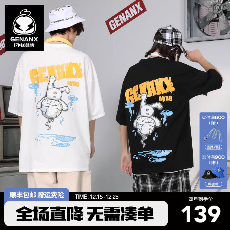 GENANX潮牌短袖男夏季新款宽松简约卡通印花新疆棉花t恤情侣装ins