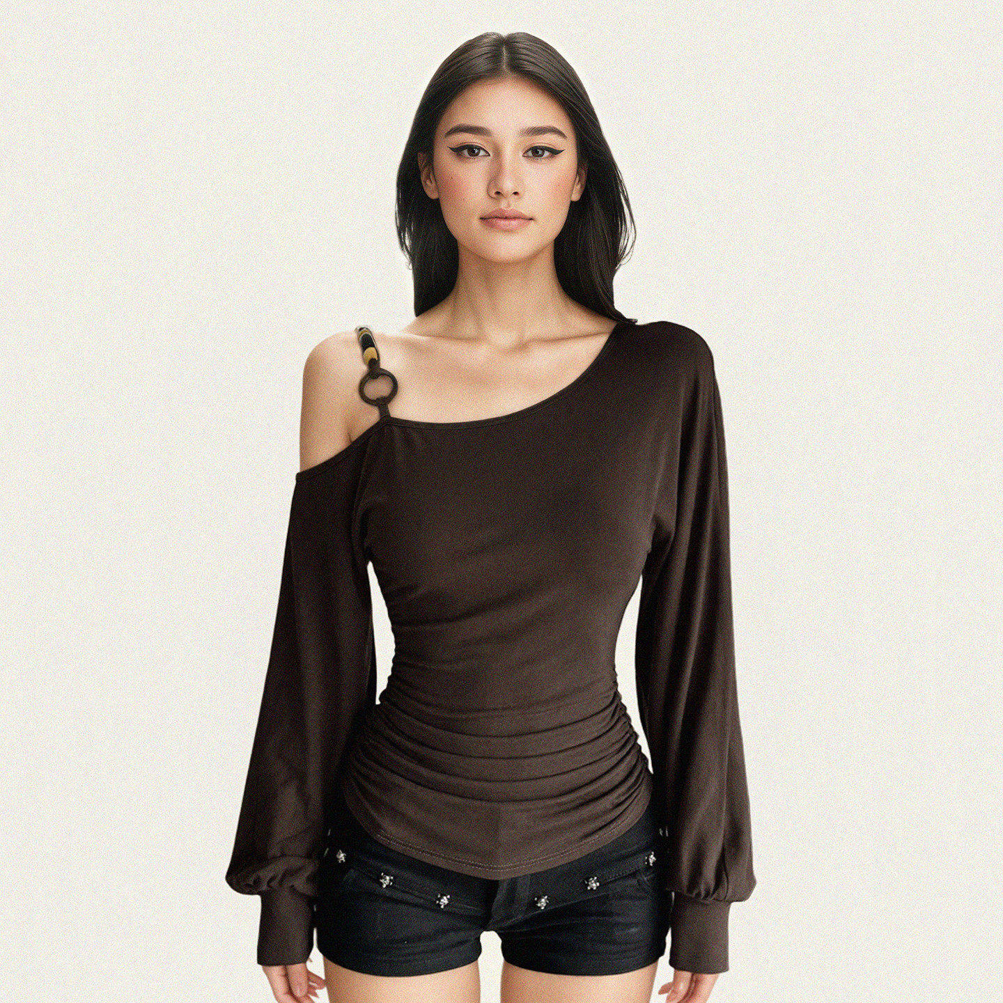 FUNOFF美式复古棕色斜肩串珠灯笼长袖T恤2025秋冬露肩收腰上衣女