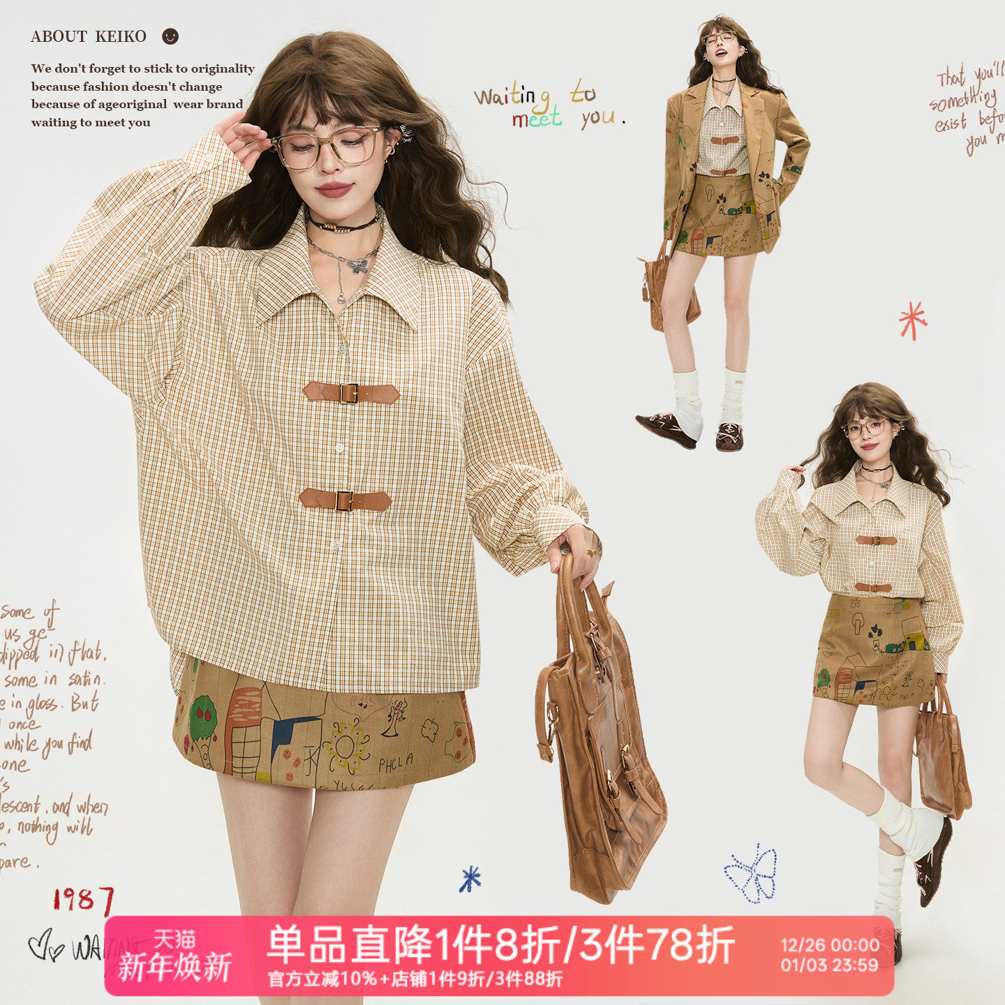 KEIKO 巴恩风格子长袖衬衫女2025秋季通勤复古灯笼袖宽松纯棉上衣