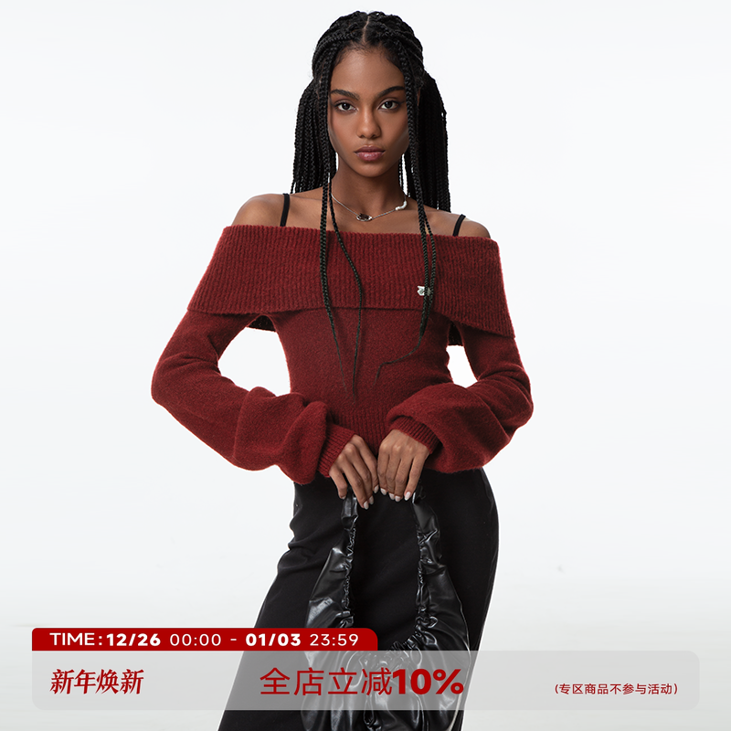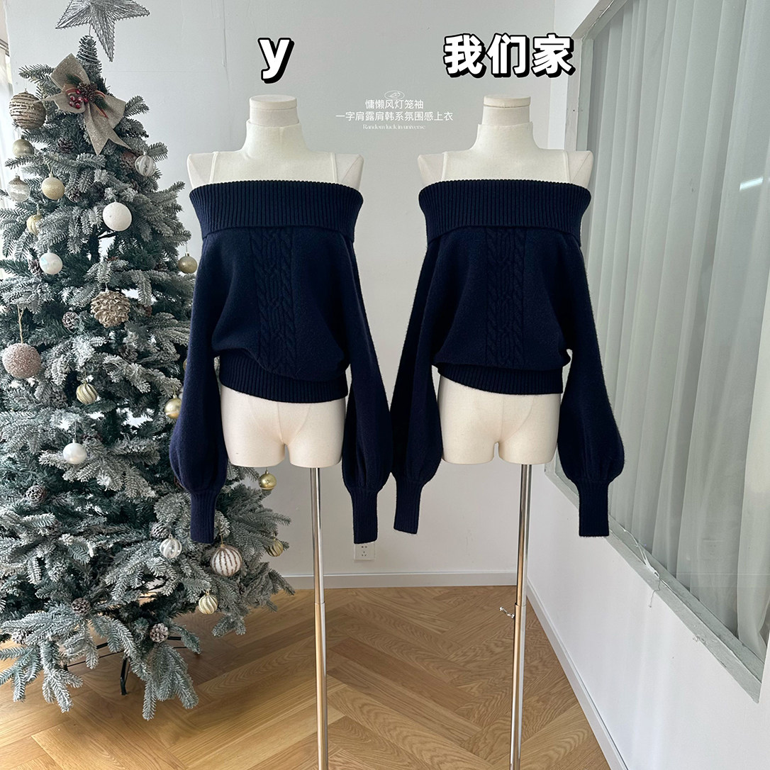 ABMY 节日战袍 一字肩毛衣女长袖针织衫女复古灯笼袖百搭修身上衣