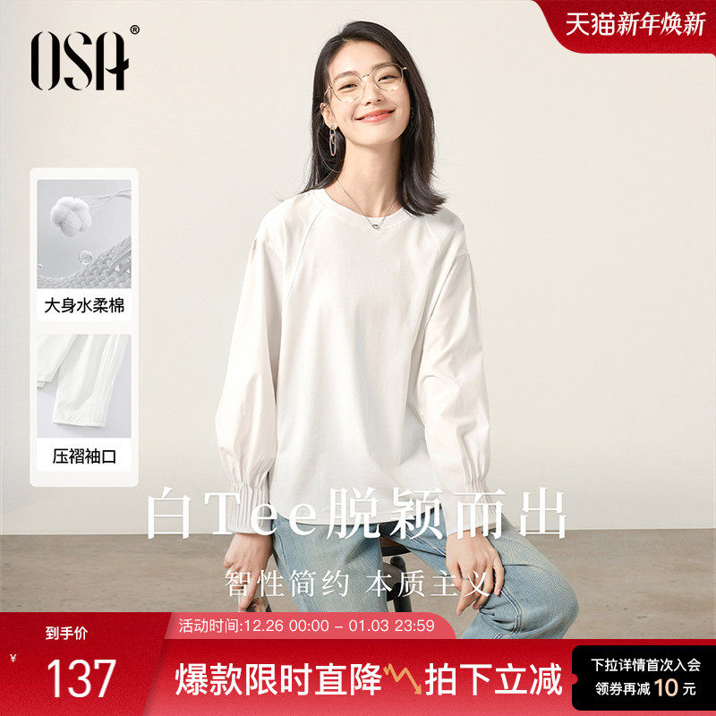 OSA欧莎灯笼袖纯色设计感T恤女2025秋季新款宽松休闲拼接长袖上衣