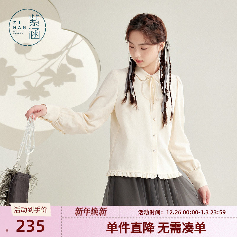 紫涵木耳边翻领灯笼袖衬衫女春秋季新款甜美盘扣领结暗纹休闲上衣