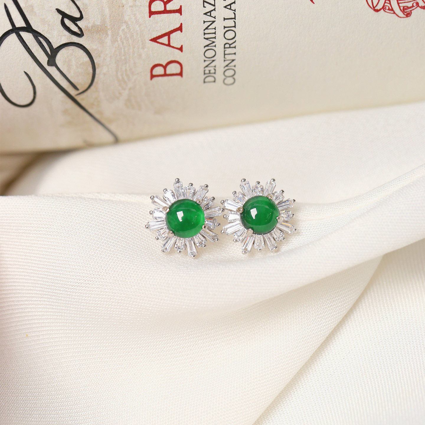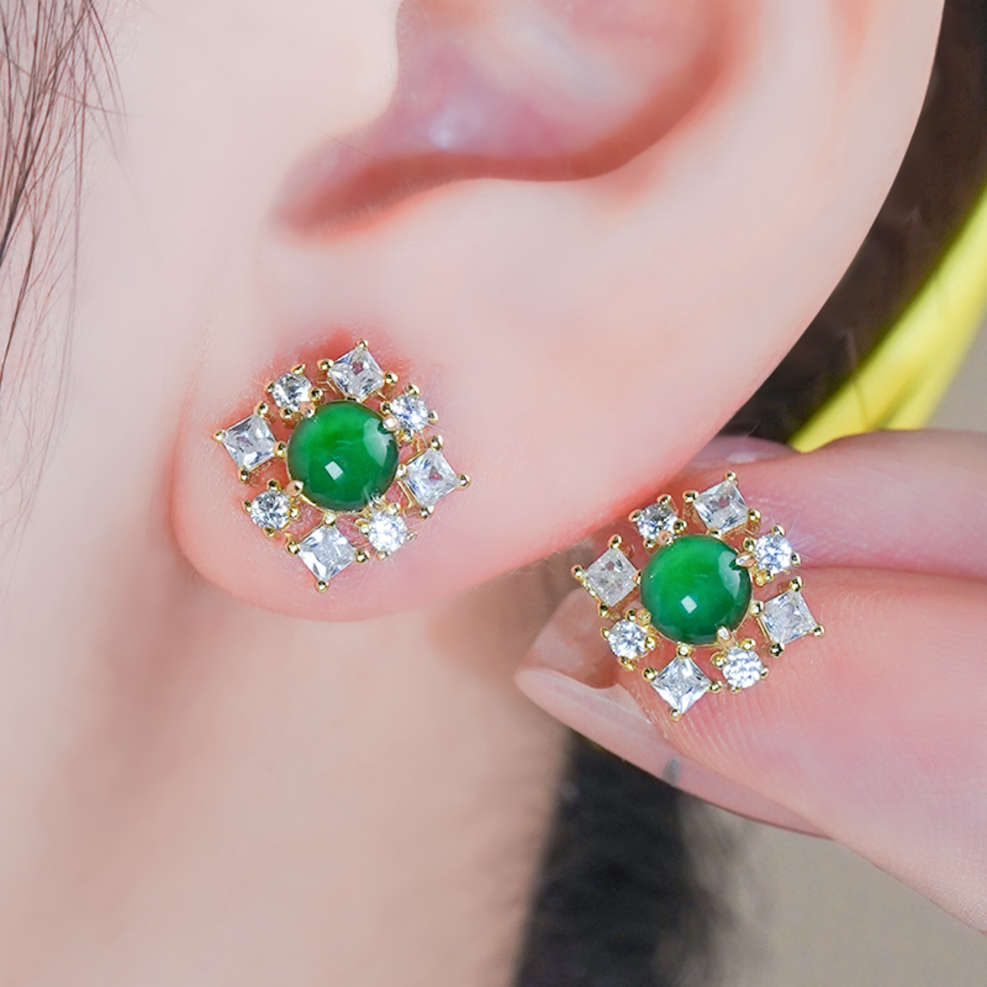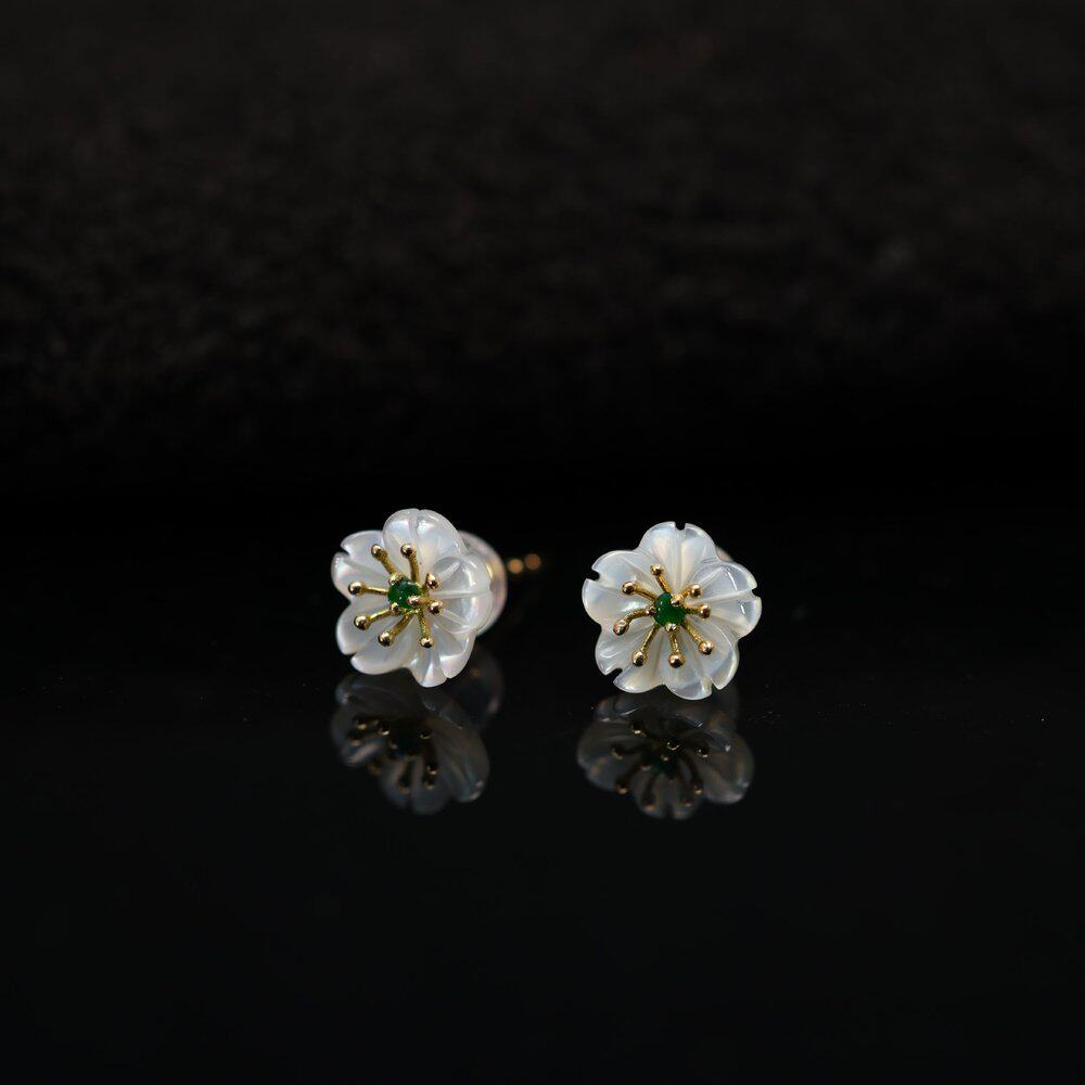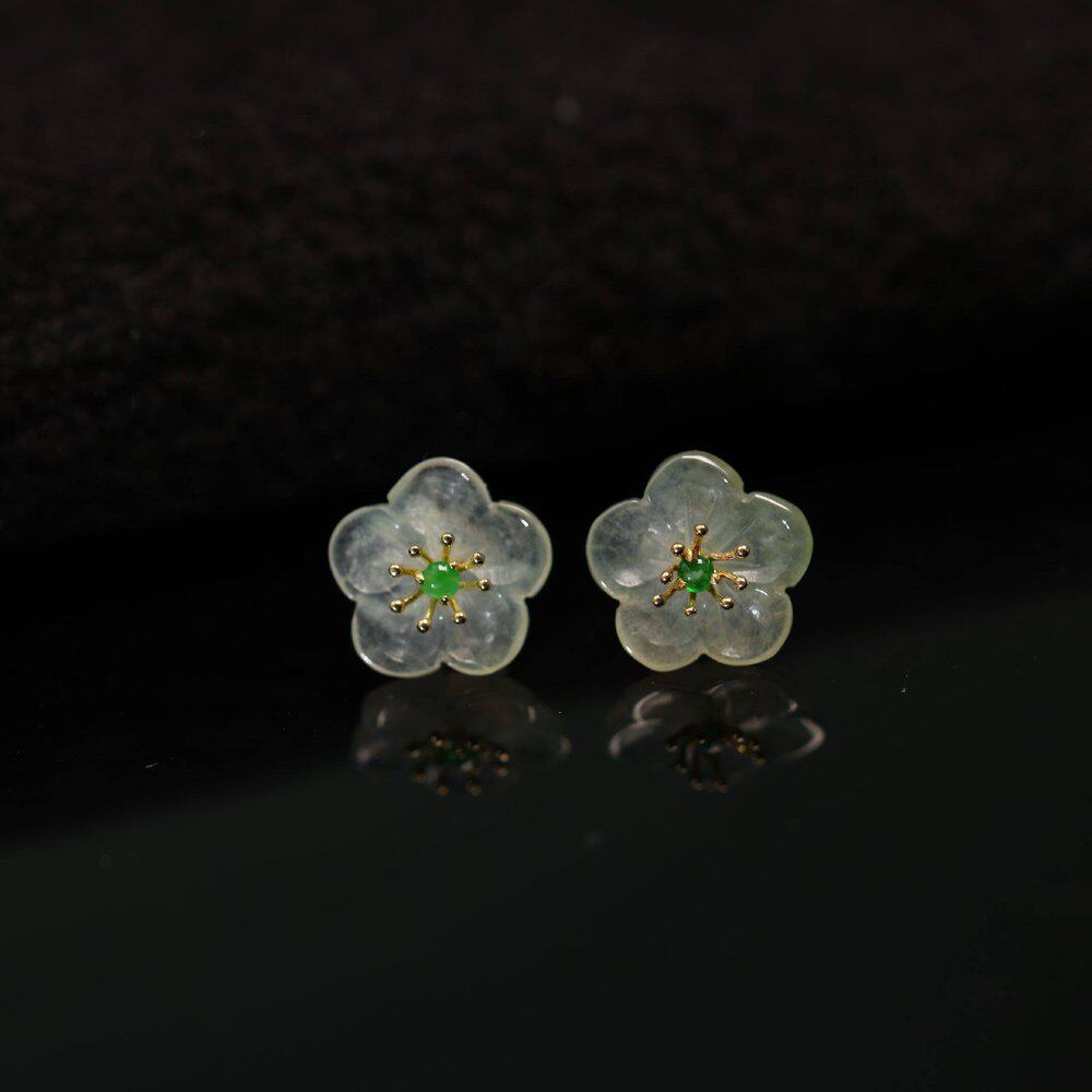 MissQueeny其微|18k金高冰翡翠蛋面花花耳钉钻石时尚气质简约