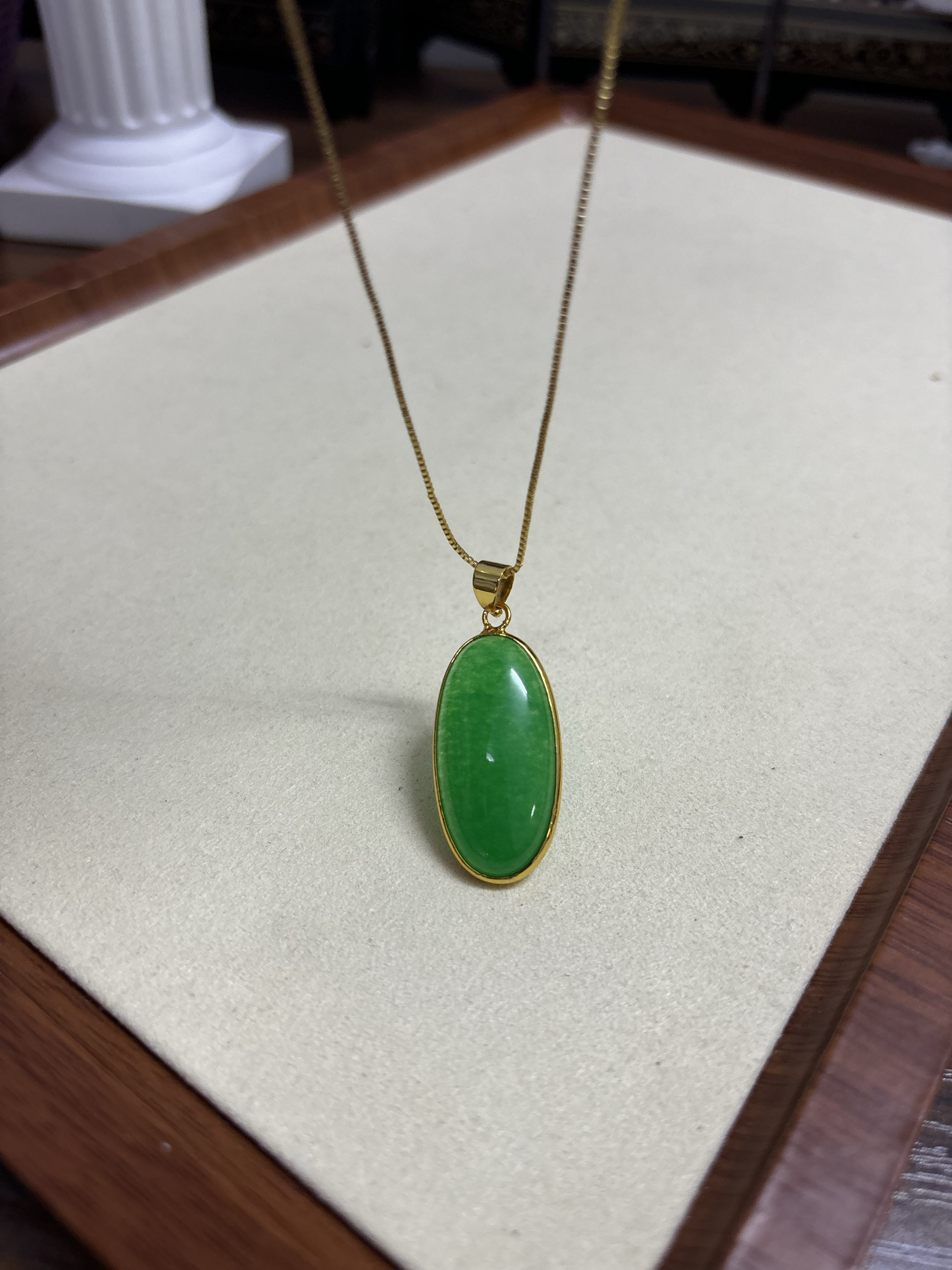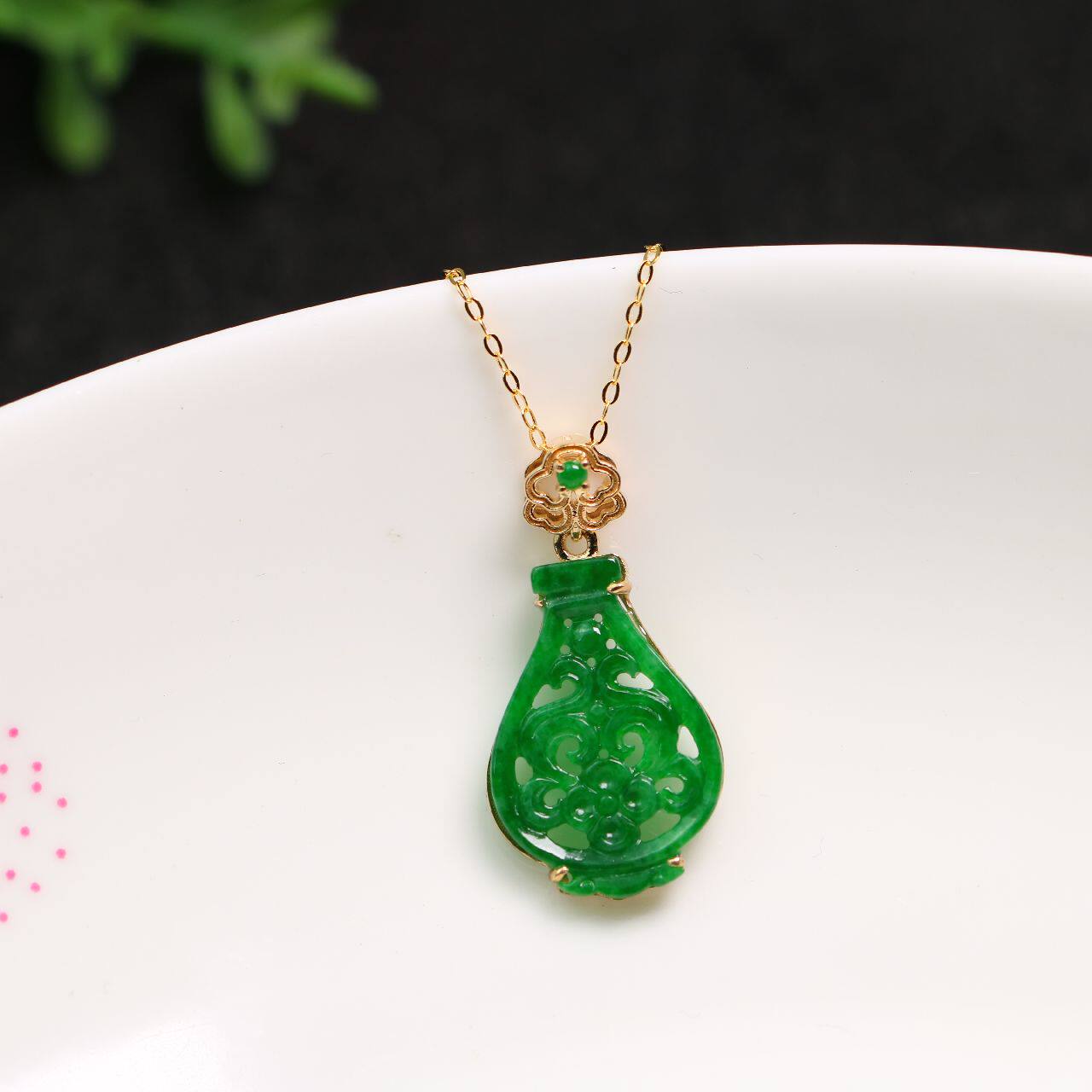 特价18K金冰绿翡翠蛋面镶嵌冰种满绿天然A货翡翠雕花花瓶锁骨吊坠