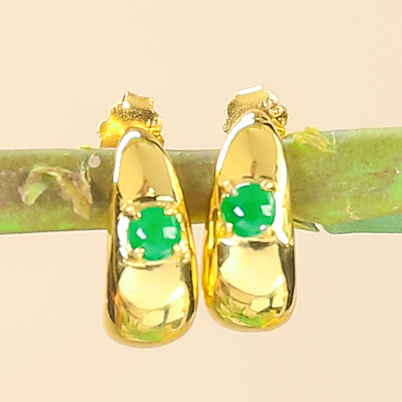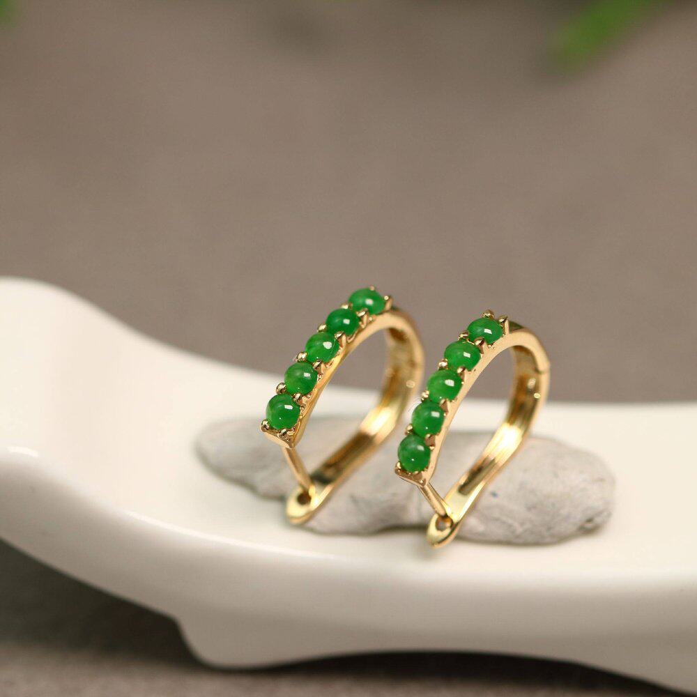 #H920 18K金镶嵌冰种满绿天然A货翡翠蛋面耳钉 圆形蛋面耳饰