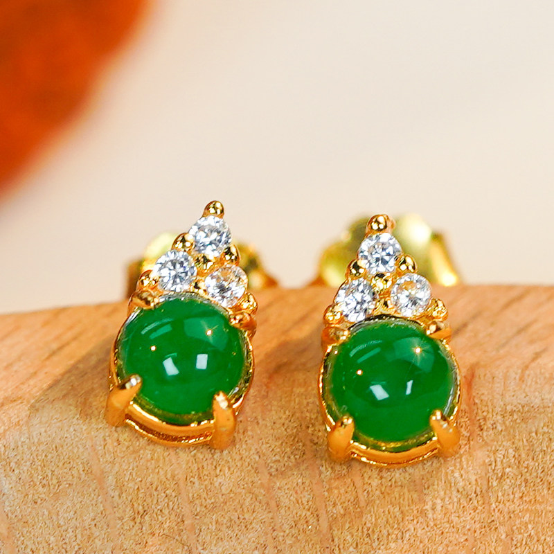 925银镶嵌天然翡翠A货精致时尚辣绿翡翠蛋面耳钉一对送妈妈送爱人