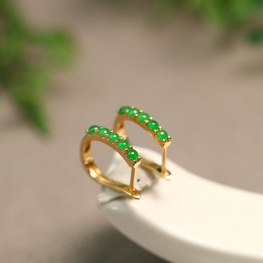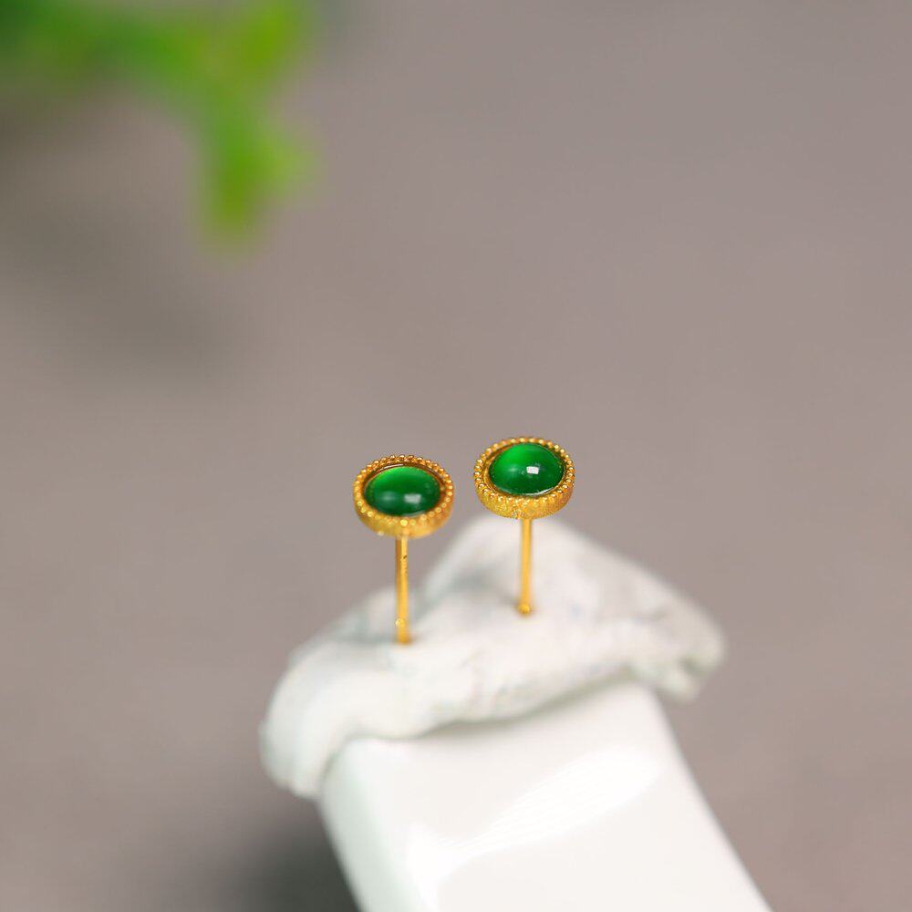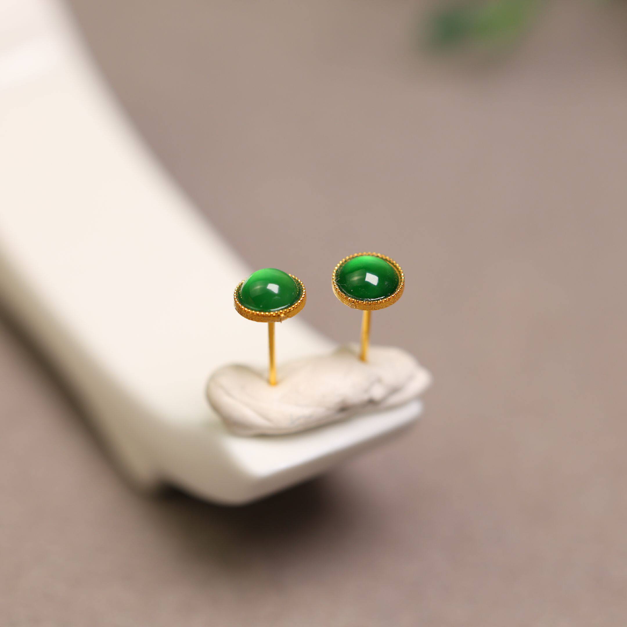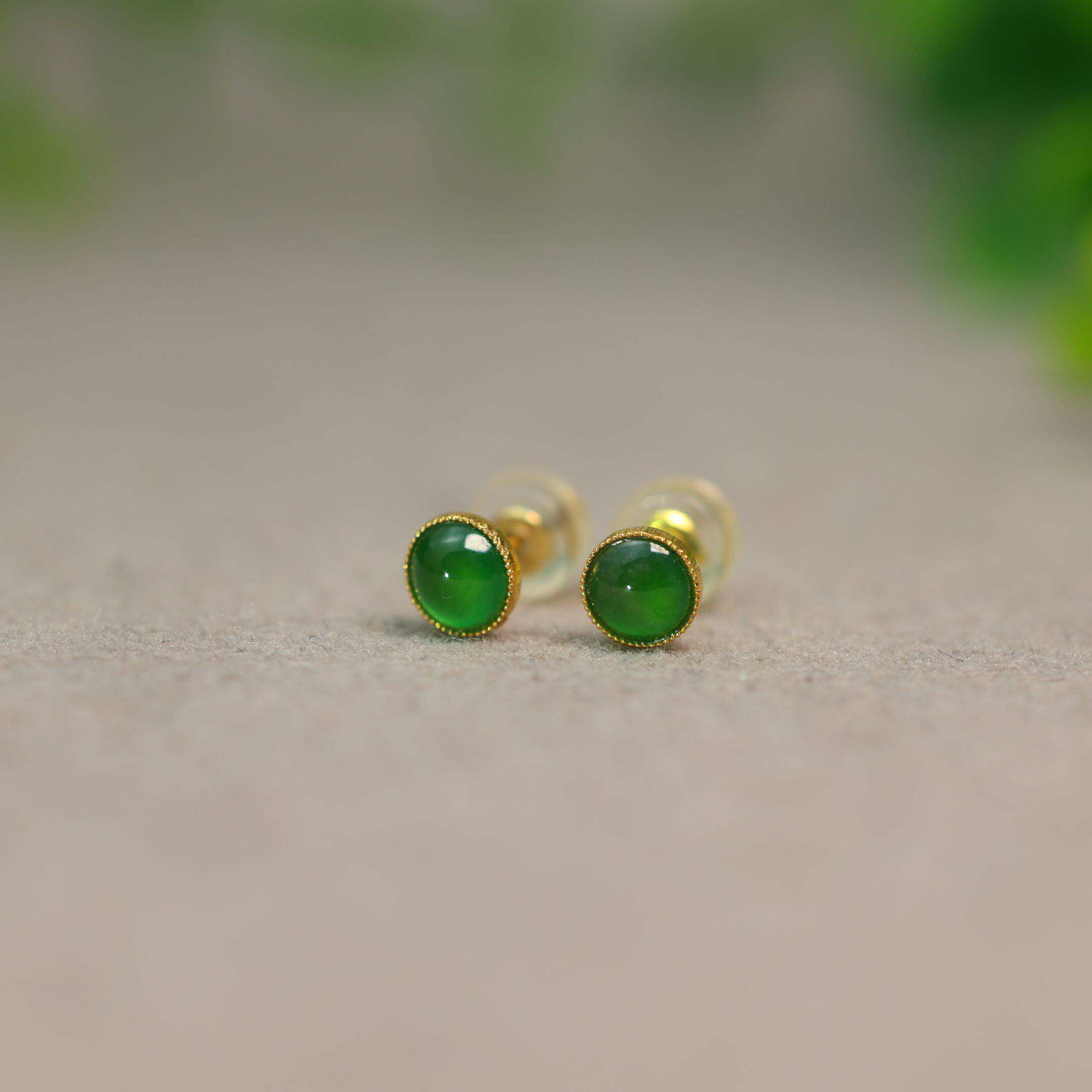 18K金镶嵌冰种满绿天然A货翡翠蛋面耳钉小圆蛋面耳饰经典简约大方