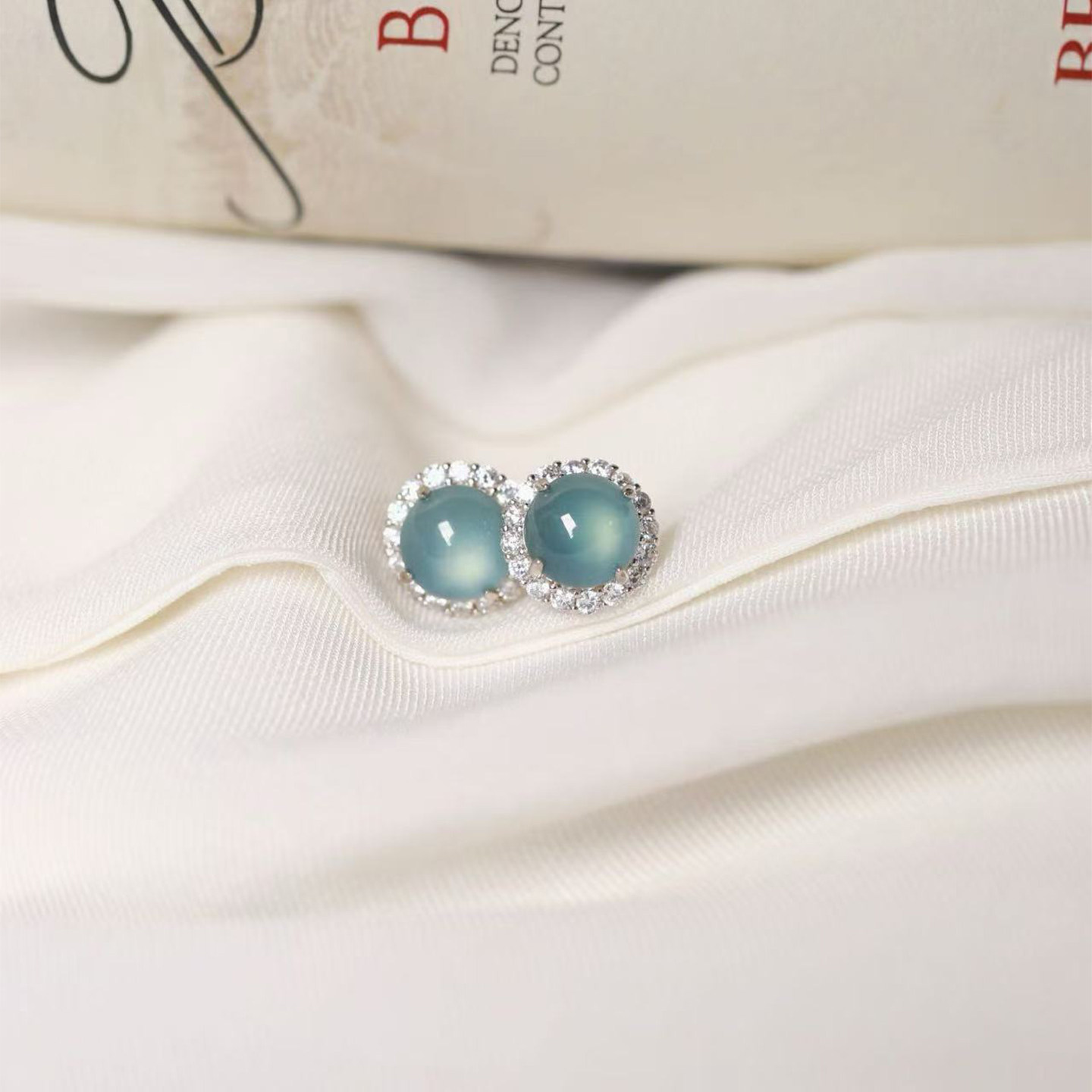 天然A货翡翠危料蓝水圆蛋面纯银镶嵌款耳钉 女款翡翠精工银耳饰品