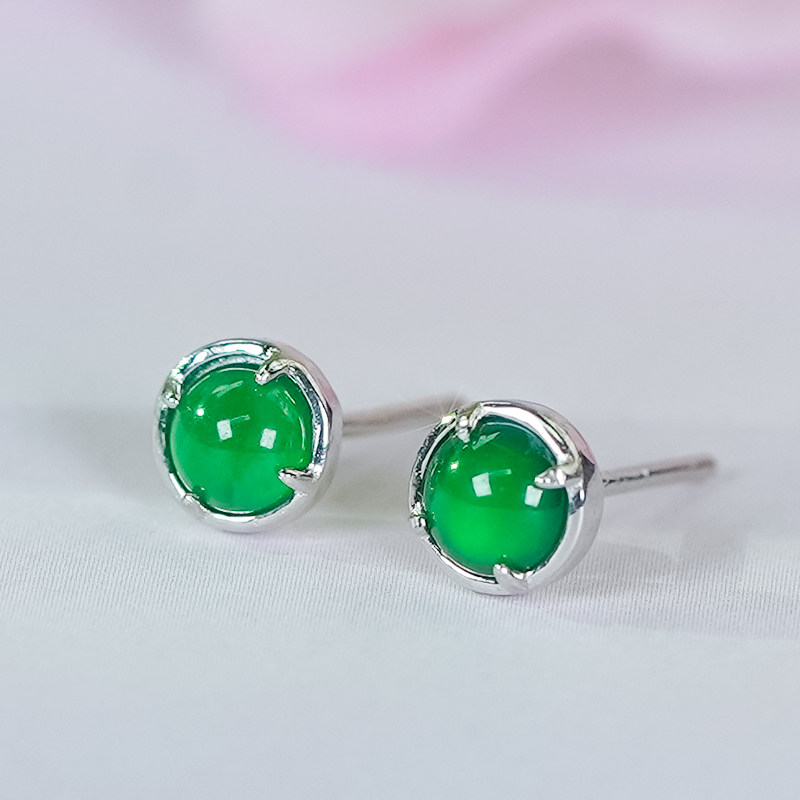 925银镶嵌天然翡翠A货精致百搭辣绿翡翠蛋面耳钉一对送妈妈送爱人