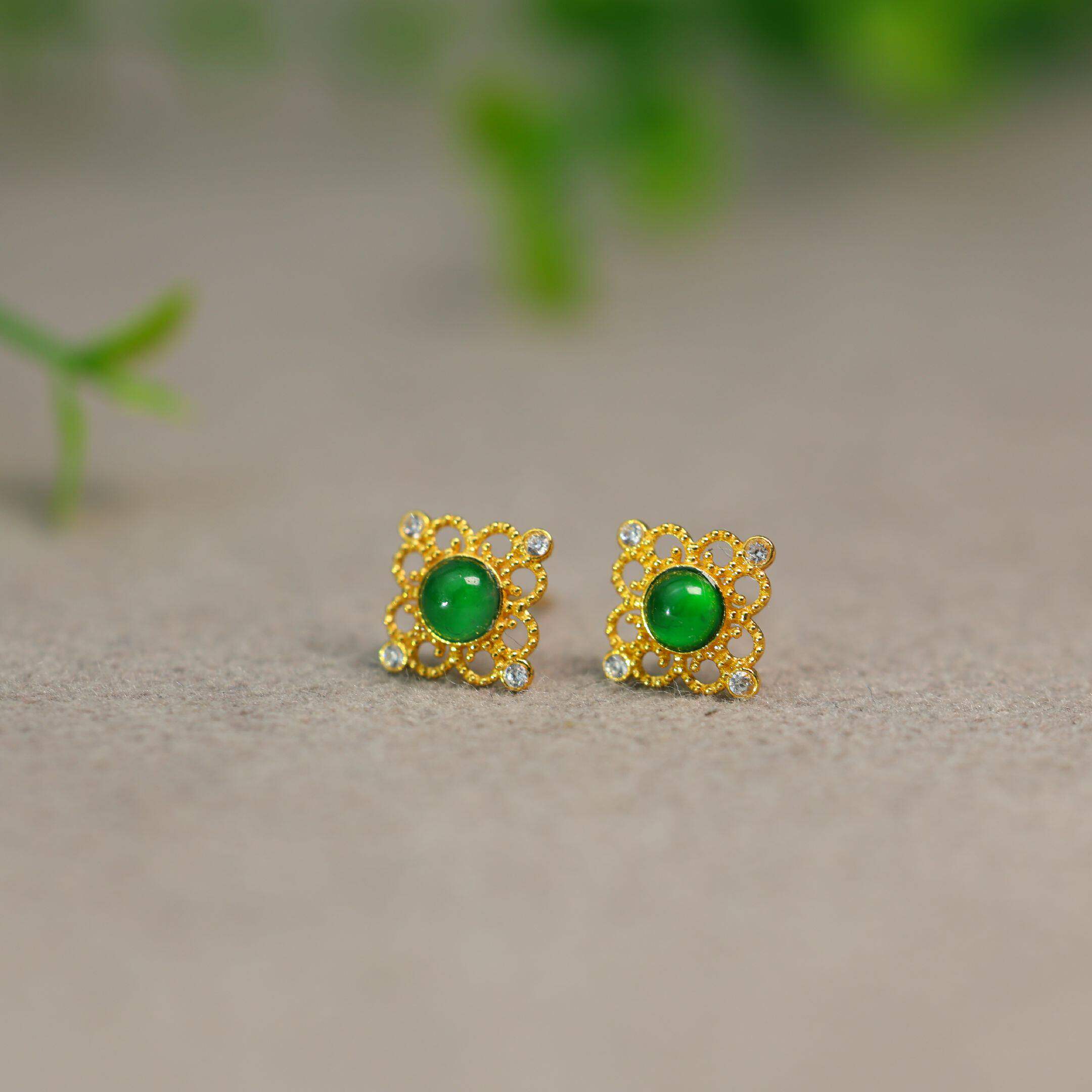 天然A货翡翠危料帝王绿蛋面纯银镶嵌款耳钉 女款翡翠精工银耳饰品
