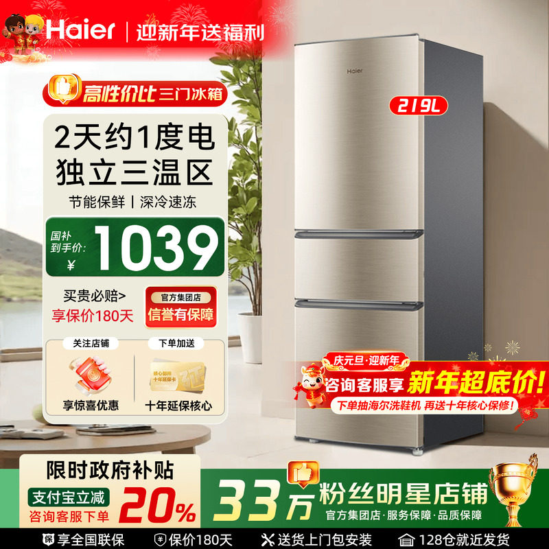 海尔电冰箱家用三门219L节能小型宿舍出租房低噪以旧换新补贴正品