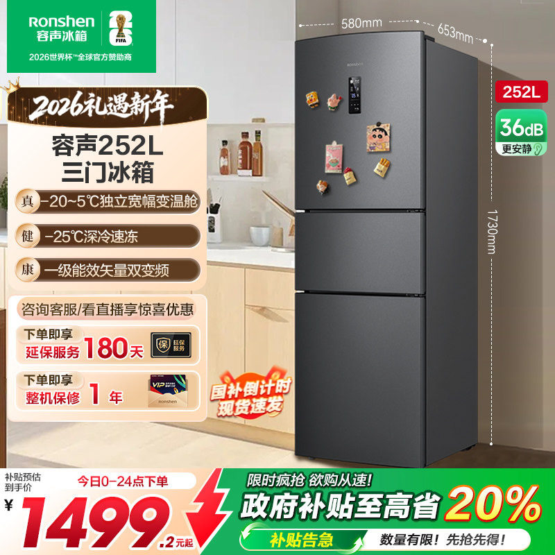 容声252L三门开门变频一级能效家用小型租房宿舍冰箱以旧换新补贴