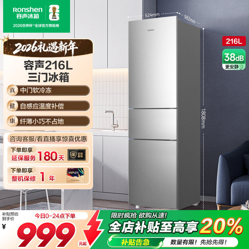 容声215L三门直冷家用冰箱宿舍出租房省电家用小冰箱以旧换新补贴