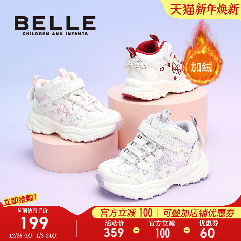 百丽童鞋女童运动鞋加绒棉鞋冬季小女孩软底儿童休闲鞋户外登山鞋